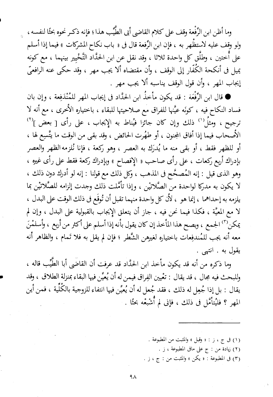 قَالَ ابْن الرّفْعَة قد يكون مَأْخَذ ابْن الْحداد فى إِيجَاب الْمهْر للمندفعة وَإِن بَان فَسَاد النِّكَاح فِيهِ كَونه عينهَا للفراق مَعَ صلاحيتها للبقاء بِاخْتِيَارِهِ الْأُخْرَى مَعَ أَنه لَا تَرْجِيح وَمثل ذَلِك وَإِن كَانَ جَائِزا فيناط بِهِ الْإِيجَاب على رأى بعض الْأَصْحَاب فِيمَا إِذا أَفَاق الْمَجْنُون أَو طهرت الْحَائِض وَقد بقى من الْوَقْت مَا يَتَّسِع لَهَا أَو لِلظهْرِ فَقَط أَو بقى مِنْهُ مَا يدْرك بِهِ الْعَصْر وَهُوَ رَكْعَة فَإنَّا نلزمه الظّهْر وَالْعصر بِإِدْرَاك أَربع رَكْعَات على رأى صَاحب الإفصاح وبإدراك رَكْعَة فَقَط على رأى غَيره وَهُوَ الذى قيل إِنَّه الْمُصَحح فى الْمَذْهَب وكل ذَلِك مَعَ قَوْلنَا إِنَّه لَو أدْرك دون ذَلِك لَا يكون بِهِ مدْركا لوَاحِدَة من الصَّلَاتَيْنِ وَإِذا تَأَمَّلت ذَلِك وجدت إِلْزَامه للصلاتين بِمَا يلْزمه بِهِ إِحْدَاهمَا إِنَّمَا هُوَ لِأَن كل وَاحِدَة مِنْهُمَا تقبل أَن توقع فى ذَلِك الْوَقْت على الْبَدَل لَا مَعَ الْمَعِيَّة فَكَذَا فِيمَا نَحن فِيهِ جَازَ أَن يتَعَلَّق الْإِيجَاب بالقبولية على الْبَدَل وَإِن لم يُمكن الْجمع وَيصِح هَذَا المأخذ إِن كَانَ يَقُول بِأَنَّهُ إِذا أسلم على أَكثر من أَربع وأسلمن مَعَه أَنه يجب للمندفعات بِاخْتِيَارِهِ لغيرهن الشّطْر فَإِن لم يقل بِهِ فَلَا تَمام وَالظَّاهِر أَنه يَقُول بِهِ انْتهى