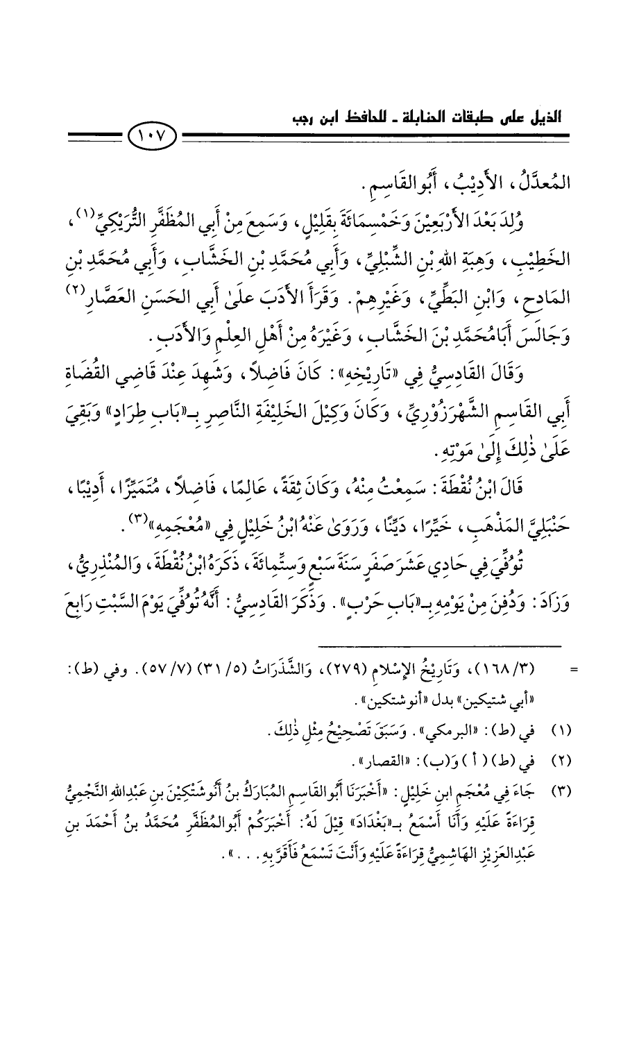 وَقَالَ القادسي فِي تاريخه: كَانَ فاضلا. وشهد عند القاضي أبي القاسم الشهرزوري. وَكَانَ وكيل الخليفة الناصر بباب طراد، وبقي عَلَى ذَلِكَ إِلَى موته.