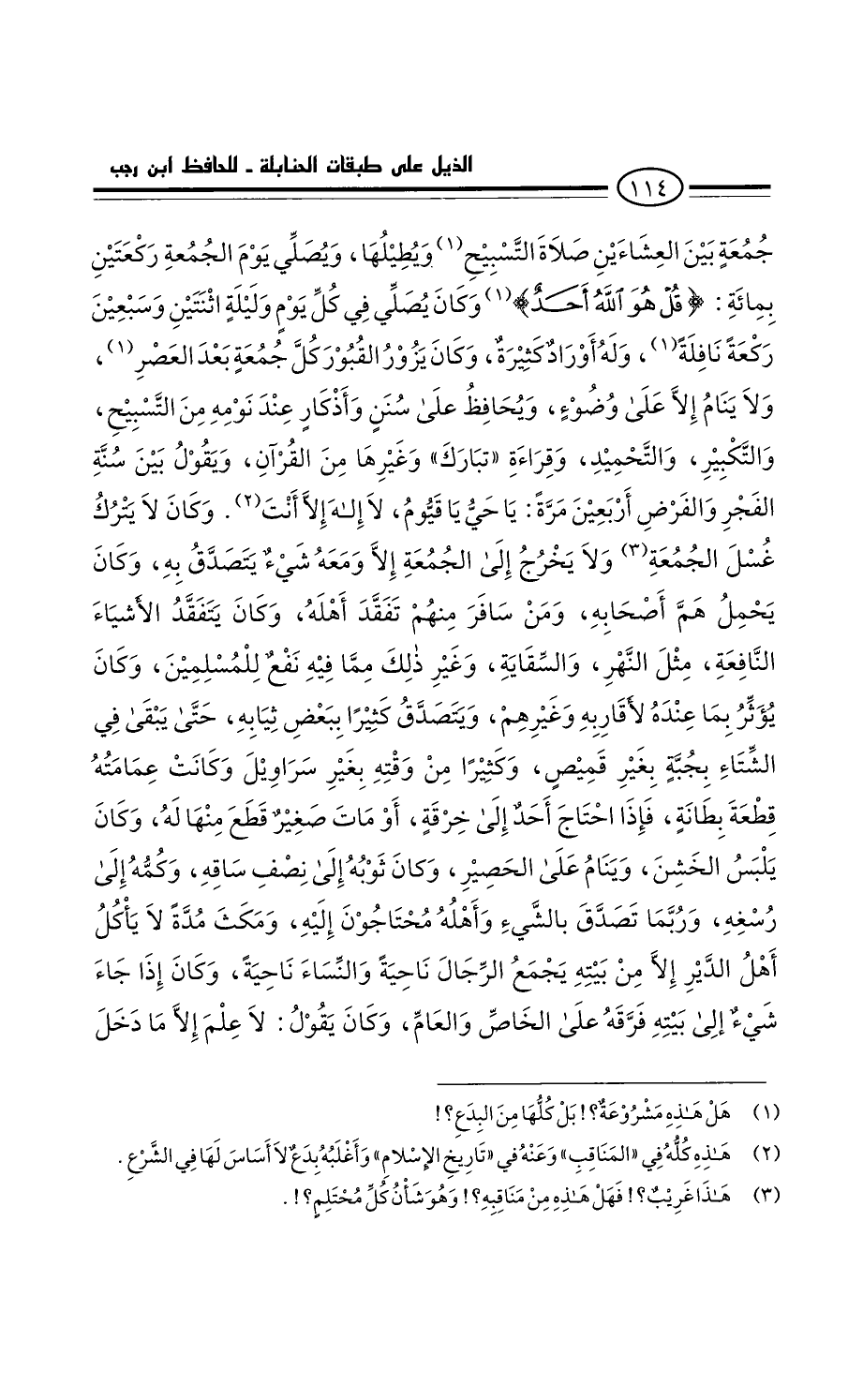 جمعة بَيْنَ العشاءين صلاة التسبيح ويطيلها، ويصلَّي يَوْم الجمعة ركعتين بمائة " قُلْ هُوَ اللَّهُ أَحَدٌ " " الإخلاص: ١ "، وَكَانَ يصلي فِي كُل يَوْم وليلة اثنتين وسبعين ركعة نافلة، وله أوراد كثيرة. وكارْ يزور القبور كُل جمعة بَعْد العصر، ولا ينام إلا عَلَى وضوء، ويحافظ على سمْن وأذكار عِنْدَ نومه: من التسبيح، والتكبير، والتحميد، وقراءة تبارك، وغيرها من الْقُرْآن، وَيَقُول بَيْنَ سنة الفجر والفرض أربعين مرة يا حي يا قيوم، لا إله إلا أَنْتَ.