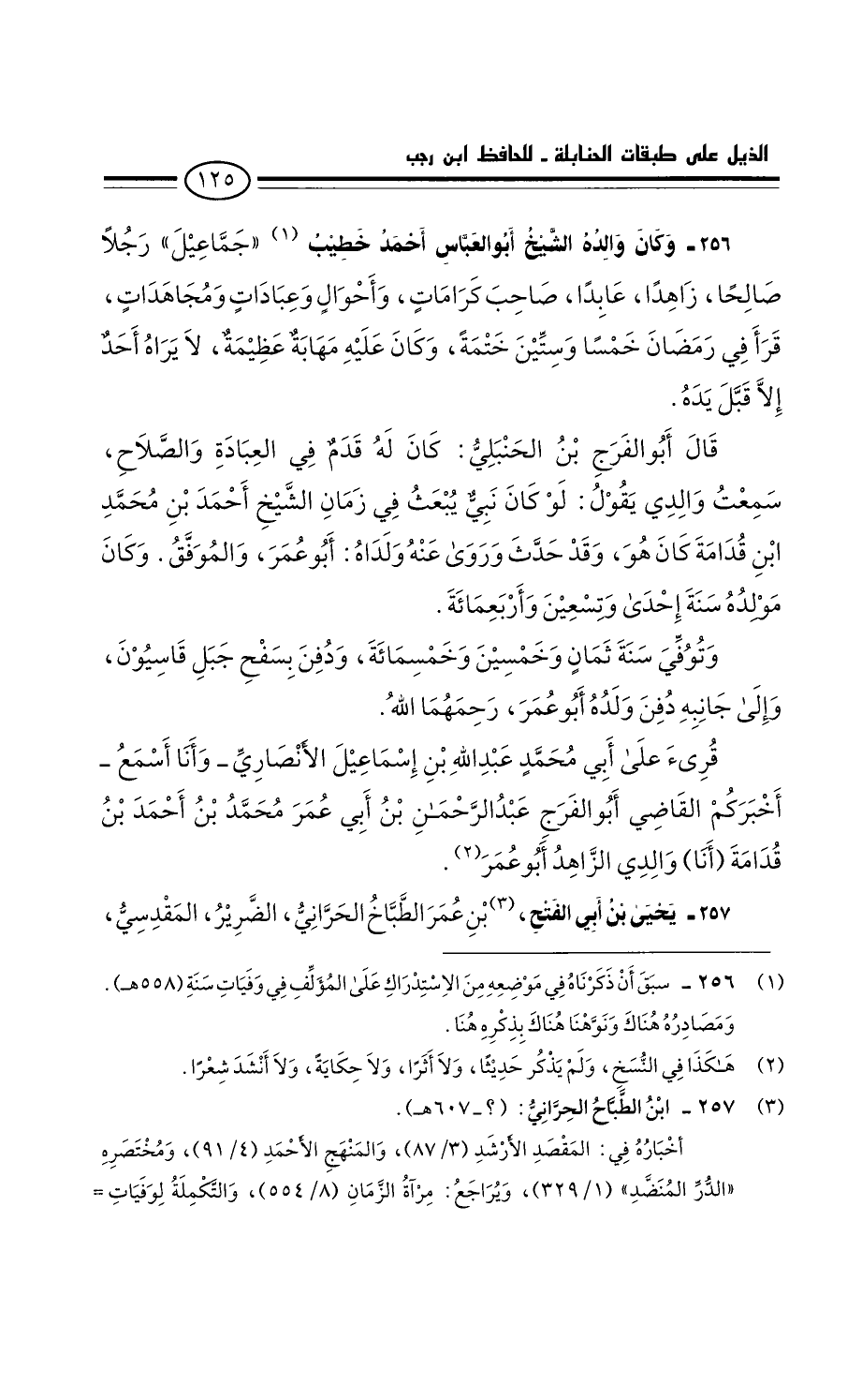 قرئ عَلَى أَبِي مُحَمَّد عَبْد اللَّهِ بْن إِسْمَاعِيل الأَنْصَارِي - وأنا أسمع - أخبركم مُحَمَّد بن أحمد القاضي أبو الفوج عبد الرحمن بن أبي عمر محمد أَحْمَد بْن قدامة أَخْبَرَنَا والدي الزاهد أَبُو عُمَر.
