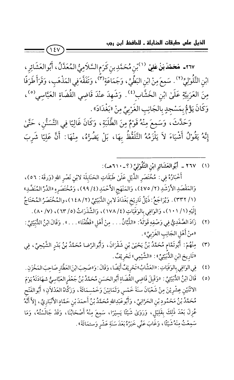 محمد بن علي بن محمد بْن كرم السلامي المعدل أَبُو العشائر، ابْن التلولي: سمع من ابْن البطي، وجماعة. وتفقه فِي المذهب، وقرأ طرفا من العربية عَلَى ابْن الخشاب.