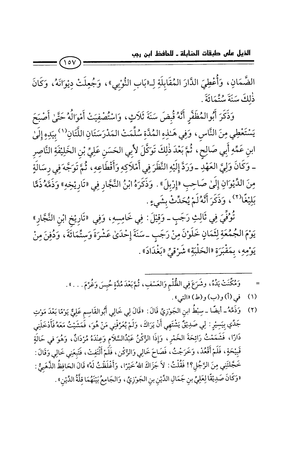وذكر أَبُو المظفر: أَنَّهُ قبض عَلَيْهِ سنة ثَلاث، واستصفيت أمواله، حَتَّى أصبح يستعطي من النَّاس. وَفِي هذه المدة سلمت المدرستان الَّتِي بيده إِلَى ابْن عمه أَبِي صَالِح، ثُمَّ بَعْد ذَلِكَ توكل لأبى الحسن على ابن الخليفة الناصر - وَكَانَ ولي العهد - ورد إِلَيْهِ النظر فِي أملاكه وإقطاعه، ثم توجه فِي رسالة من الديوان إِلَى صاحب أربل.