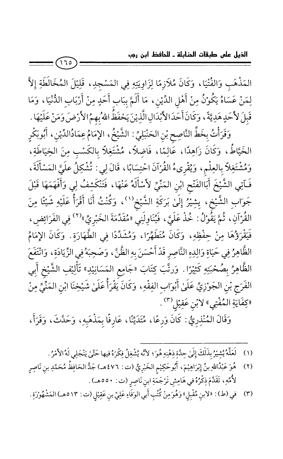 وقرأت بخط الناصح بْن الحنبلي: الشيخ الإِمام عماد الدين أَبُو بَكْر الخياط، وَكَانَ زاهدا، عالما، فاضلا، مشتغلا بالكسب من الخياطة، ومشتغلا بالعلم، ويقرئ الْقُرْآن احتسابا، قَالَ لي: تشكَل عليَّ المسألة، فأتى الشيخ أبا الفتح بْن المنى لأسأله عَنْهَا، فتنكشف لي وأفهمها قبل جواب الشيخ، يشير إِلَى بركة الشيخ. وكنت أنا أقرأ عَلَيْهِ شَيْئًا من الْقُرْآن، ثُمَّ يَقُول: خذ عليَّ، فيناولني " مقدمة الخبري " فِي الفرائض، فيقرؤها من حفظه. وَكَانَ متطهرا ومشددا فِي الطهارة.