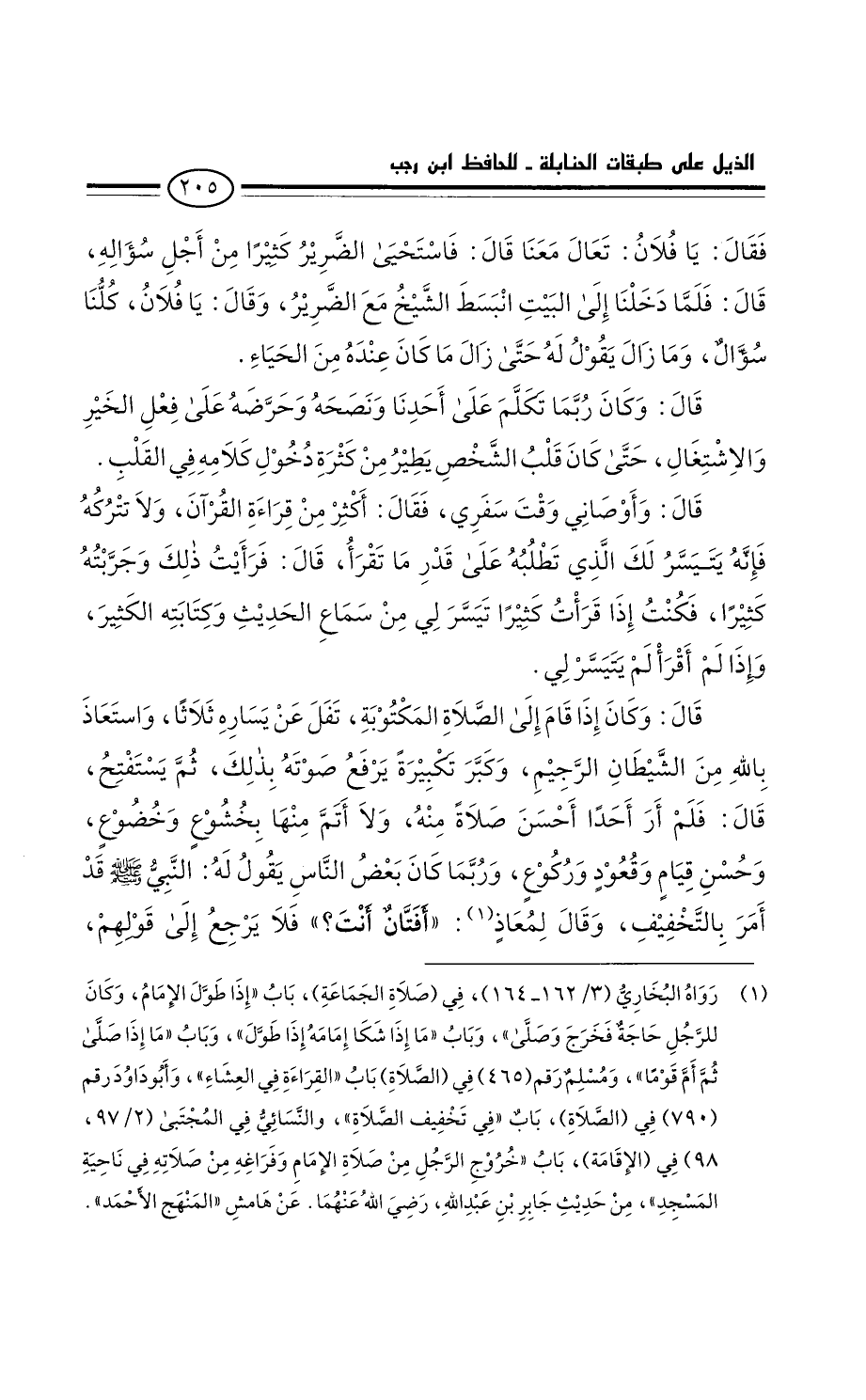قَالَ: وَكَانَ إِذَا قام إِلَى الصلاة المكتوبة، تفل عَن يساره ثلاثا، واستعاذ بالله من الشَّيْطَان الرجيم، وكبر تكبيرة يرفع صوته بِذَلِكَ، ثُمَّ يستفتح، قَالَ: فلم أرَ أحدا أَحْسَن صلاة منه، ولا أتم منها بخشوع وخضوع، وحسن قيام وقعود وركوع، وربما كَانَ بَعْض النَّاس يَقُول لَهُ: النَّبِي صَلَّى اللَّهُ عَلَيْهِ وَسَلَّمَ قَدْ أمر بالتخفيف وَقَالَ لمعاذ: " أفتان أَنْتَ؟ " فلا يرجح إِلَى قولهم،