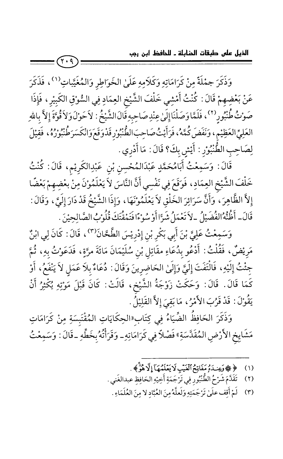 وذكر جملة من كراماته وكلامه على الخواطر والمعْيبات. فذكر عَن بَعْضهم، قَالَ: كنت أمشي خلف الشيخ العماد فِي السوق الكبير، فَإِذَا صوت طنبور. فلما وصلنا إِلَى عِنْدَ صاحبه قَالَ الشيخ: لا حول ولا قوة إلا بالله العلي العظيم، ونفض كمه. فرأيت صاحب الطنبور قَدْ وقع وانكسر طنبوره. فقيل لصاحب الطنبور: إيش بك؟ قَالَ: مَا أدري.