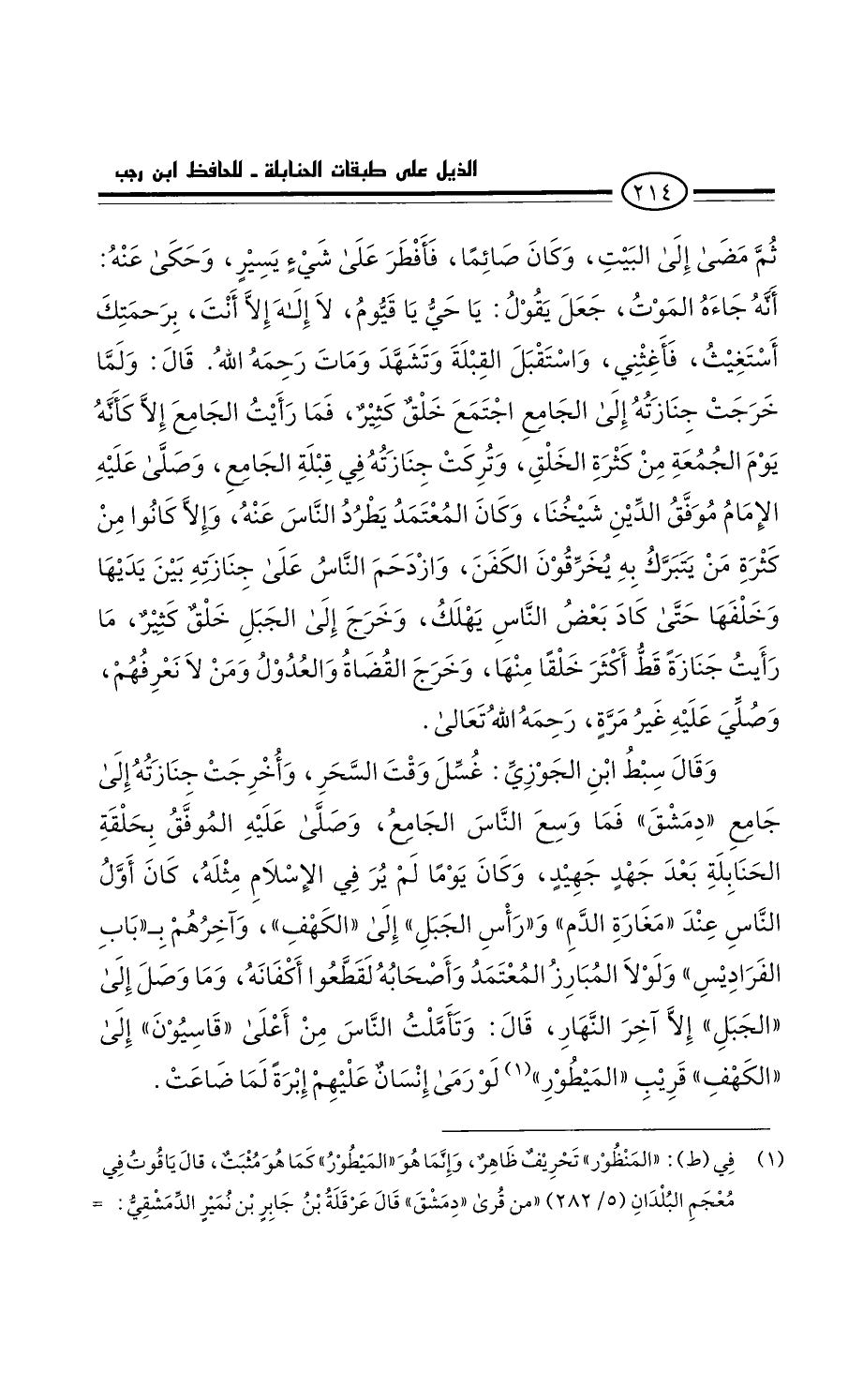 وَقَالَ سبط ابْن الجوزي: غسل وقت السحر. وأخرجت جنازته إِلَى جامع دمشق، فَمَا وسع النَّاس الجامع، وصلى عَلَيْهِ الموفق بحلقة الحنابلة بَعْد جهد جهيد، وَكَانَ يوما لَمْ يرَ فِي الإِسلام مثله. كَانَ أول النَّاس عِنْدَ مغارة الدم ورأس الجبل إِلَى الكهف، وأخرهم بباب الفراديس. ولولا المبارز المعتمد وأَصْحَابه: لقطعوا أكفانه. وَمَا وصل إِلَى الجبل إِلَى آخر النهار. قَالَ: وتأملت النَّاس من أعلى قاسيون إِلَى الكهف قريب المنظور، لو رمى إِنْسَان عَلَيْهِم إبرة لما ضاعت.