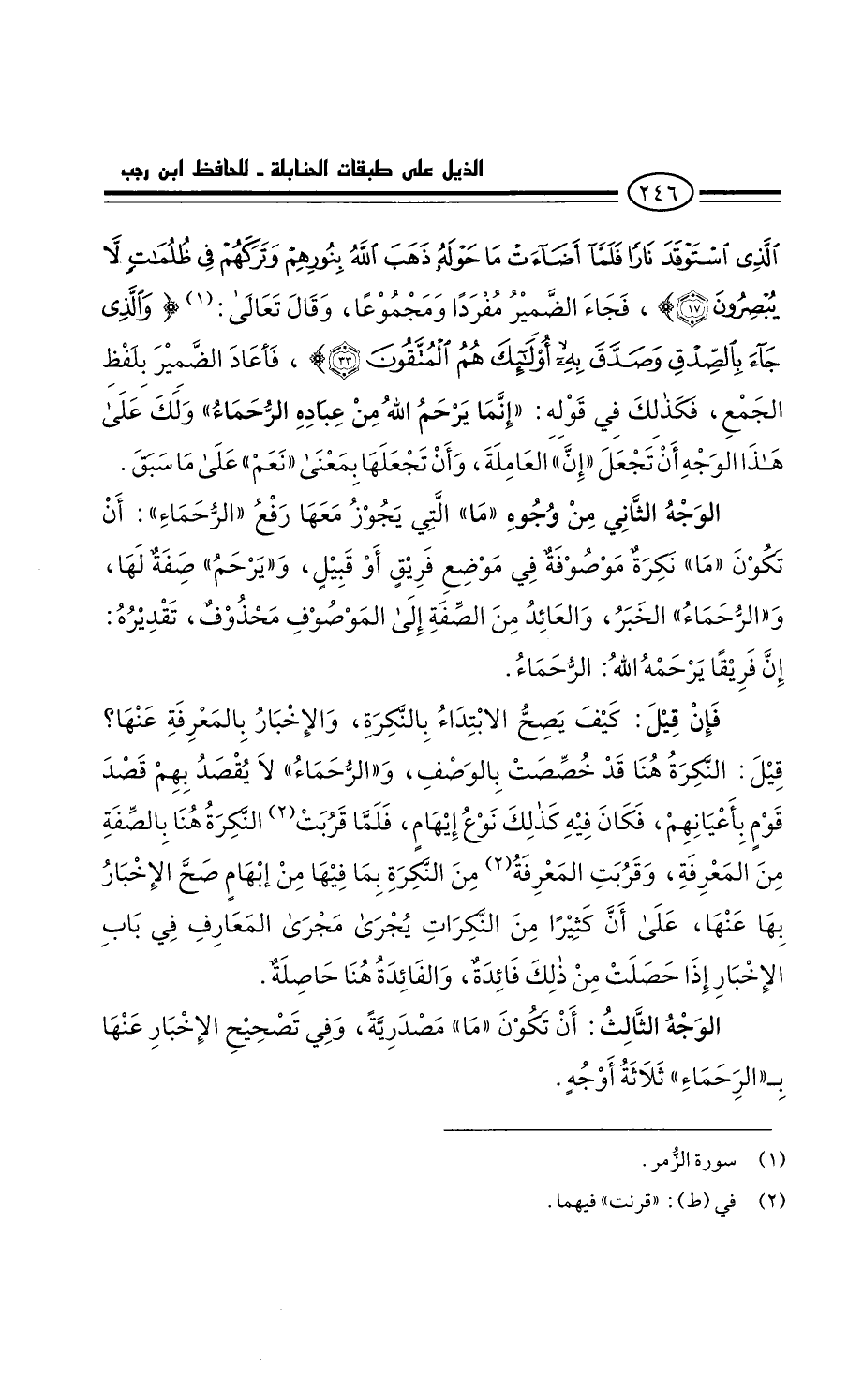 الني اسْتَوْقَدَ نَارًا. فَلَمَّا أَضَاءَتْ مَا حَوْلَهُ ذَهَبَ اللَّهُ بِنُورِهِمْ، وَتَرَكَهُمْ فِي ظُلُمَاتٍ لا يُبْصِرُونَ " " البقرة: ١٧ "، فجاء بالضمير مفردا ومجموعا، وَقَالَ تَعَالَى: " وَالَّذِي جَاءَ بِالصِّدْقِ وَصَدَّقَ بِهِ أُولَئِكَ هُمُ الْمُتَّقُونَ " " الزمر: ٣٣ "، فأعاد الضمير بلفظ الجمع، فَكَذَلِكَ فِي قَوْله: " إِنَّمَا يرحم اللَّه من عباده الرحماء "، ولك عَلَى هَذَا الوجه أَن تجعل " إِن " العاملة، وأن تجعلها بمعنى " نعم " عَلَى مَا سبق.