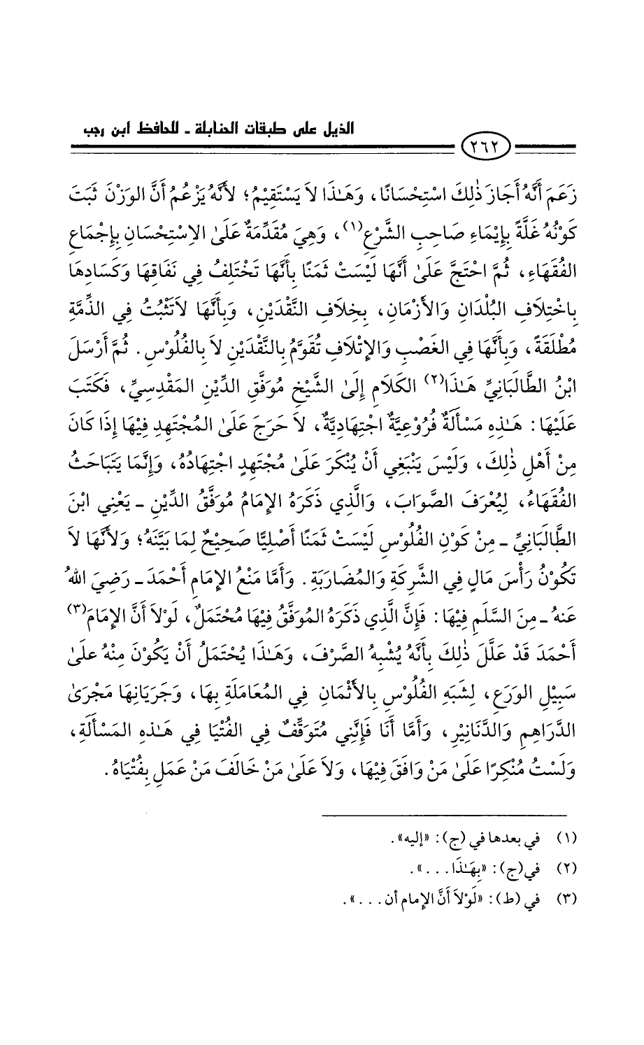 فكتب عَلَيْهَا: هذه مسألة فروعية اجتهادية، لا حرج عَلَى المجتهد فِيهَا إِذَا كَانَ من أهل ذَلِكَ، وليس ينبغي أَن ينكر عَلَى مجتهد اجتهاده، وإنما يتباحث الفقهاء، ليعرف الصواب. والذي ذكره الإمام موفق الدين - يَعْنِي ابْن الطالباني - من كون الفلوس ليست ثمنا أصليا: صحيح لما بينه. ولأنها لا تكون رأس مال فِي الشركة والمضاربة.