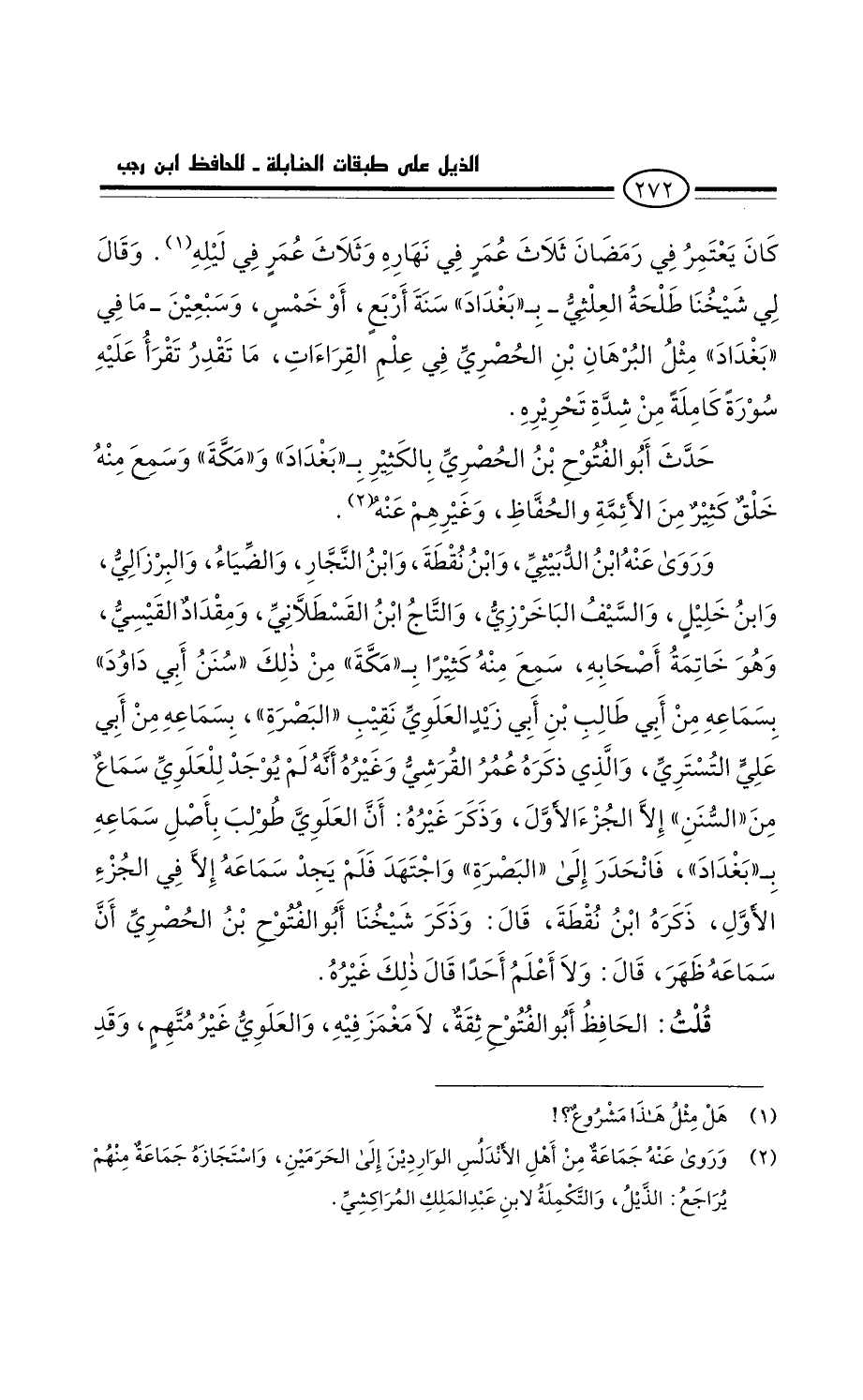 والذي ذكره عُمَر القرشي وغيره: أَنَّهُ لَمْ يوجد للعلوي سماع من السنن إلا الجزء الأَوَّل. وذكر غيره: أَن العلوي طولب بأصل سماعه ببغداد، فانحدر إِلَى البصرة، واجتهد، فلم يد سماعه إلا في الجزء الأولى. ذكره ابْن نقطة.