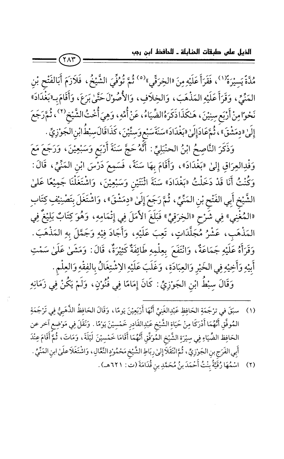 وذكر الناصح ابْن الحنبلي: أَنَّهُ حج سنة أربع وسبعين، ورجع مَعَ وفد العراق إِلَى بغداد، وأقام بها سنة، فسمع درس ابْن المنى، قَالَ: وكنت أنا قَدْ دخلت بغداد سنة اثنتين وسبعين، واشتغلنا جميعا عَلَى الشيخ أبي الفتح بن المني، ثُمَّ رجع إِلَى دمشق واشتغل بتصنيف كتاب " المغني " فِي شرح الخرقي، فبلغ الأمل فِي إتمامه، وَهُوَ كتاب بليغ فِي المذهب، عشر مجلدات، تعب عَلَيْهِ، وأجاد فِيهِ وجمل بِهِ المذهب.