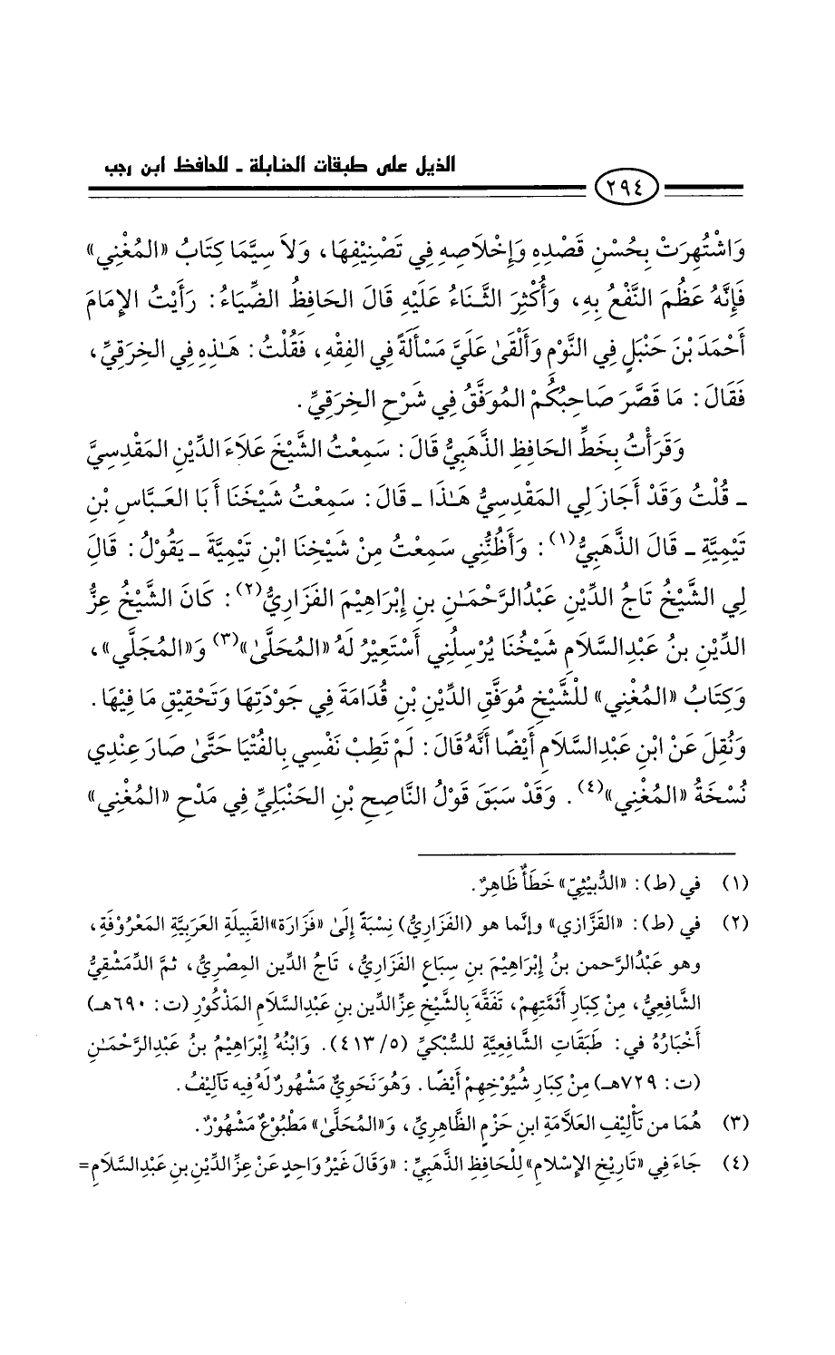 وقرأت بخط الحافظ الدبيثي قَالَ: سمعت الشيخ علاء الدين المقدسي - قلت: وقد أجاز لي المقدسي هذا - قال: سمعت شيخنا أبا العباس ابن تيمية - قال الذهبي: وأظنني سمعت من شيخنا ابْن تيمية - يقول: قال لي الشيخ الدين عَبْد الرَّحْمَنِ بْن إِبْرَاهِيم القزازاي: كَانَ الشيخ عز الدين بْن عَبْد السَّلام شيخنا يرسلني أستعير لَهُ المحلي والمجلَّي من ابْن عربي، وَقَالَ: قَالَ الشيخ عز الدين: مَا رأيت فِي كتب الإِسْلام فِي العلم مثل المحلي والمجلي، وكتاب المغنى للشيخ موفق الدين بْن قدامة فِي جودتهما وتحقيق مَا فِيهَا.