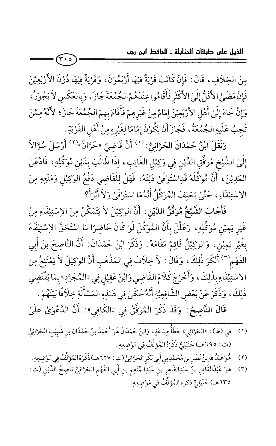 ونقل ابْن حمدان الحرائي: أَن قَاضِي حران أرسل سؤالًا إِلَى الشيخ موفق الدين فِي وكيل الغائب، إِذَا طالب بدين موكله، فادعى المدين: أَن موكله قَد استوفى دينه فهل للقاضي دفع الوكيل ومنعه من الاستيفاء، حَتَّى يحلف الموكل: أَنَّهُ مَا استوفى ولا أبرأ؟.