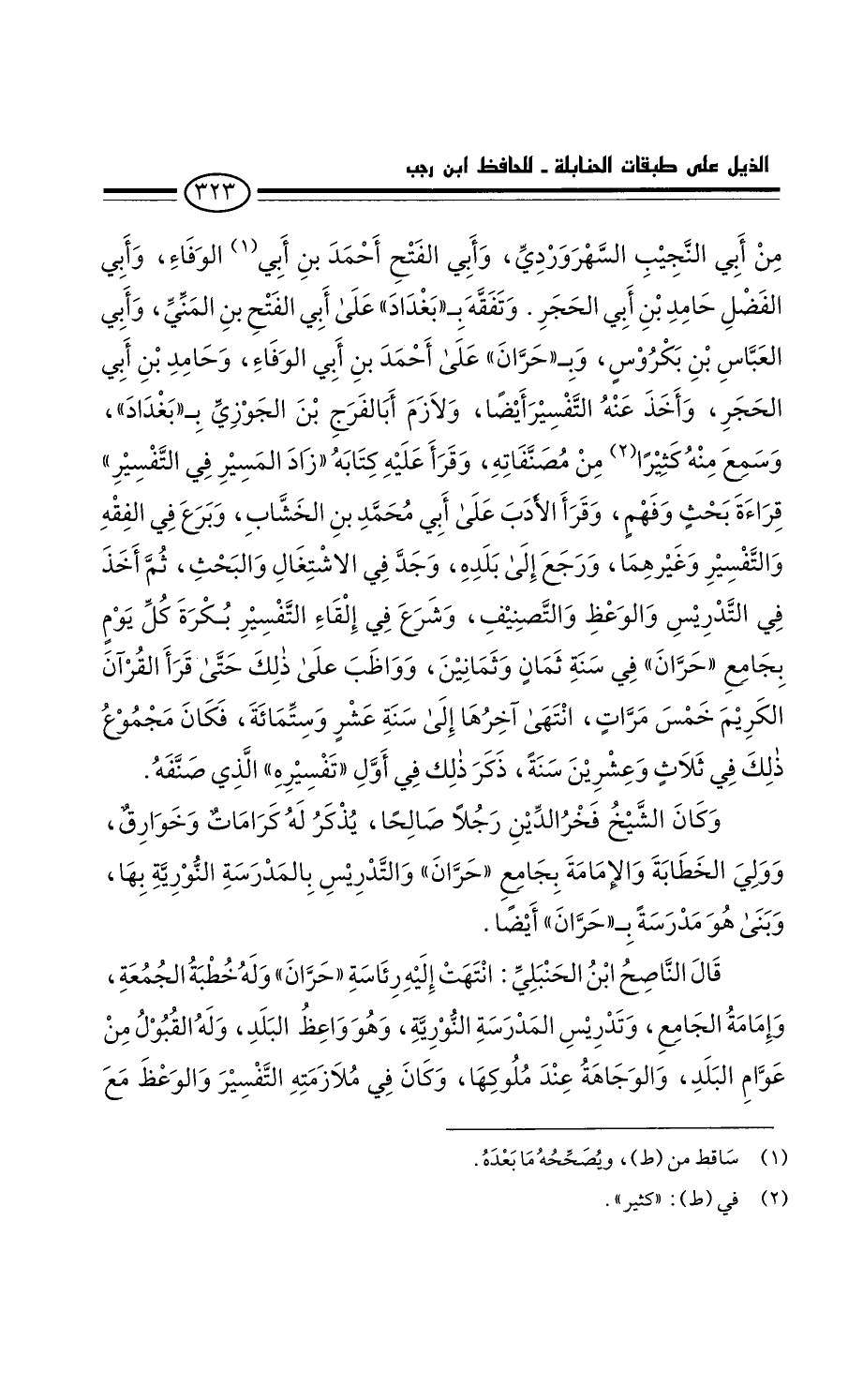 وتفقه ببغداد عَلَى أَبِي الفتح بْن المنى، وأبي الْعَبَّاس بْن بكروس، وبحران عَلَى أَحْمَد بْن أَبِي الوفاء، وحامد بْن أَبِي الحجر، وأخذ عَنْهُ التفسير أَيْضًا، ولازم أبا الفرج بن الجوزي ببغداد، وسمع منه كثير عن مصنفاته، وقرأ عليه. كتابه " زاد المسير في التفسير " قراءة بحث وفهم، وقرأ الأدب عَلَى أَبِي مُحَمَّد بْن الخشاب، وبرع فِي الفقه والتفسير وغيرهما، ورجع إِلَى بلده، وجَدَّ فِي الاشتغال والبحث، ثم أخذ في التدريس والوعظ والتصيف، وشرع في إلقاء التفسير بكرة كل يوم بجامع حران في سنة ثمان وثمانين، وواظب على ذلك حتى قرأ الْقُرْآن الكريم خمس مرات، انتهى آخرها إِلَى سنة عشر وستمائة، فكان مجموع ذَلِكَ فِي ثَلاث وعشرين سنة، ذكر ذَلِكَ فِي أول تفسيره الذي صنمه.