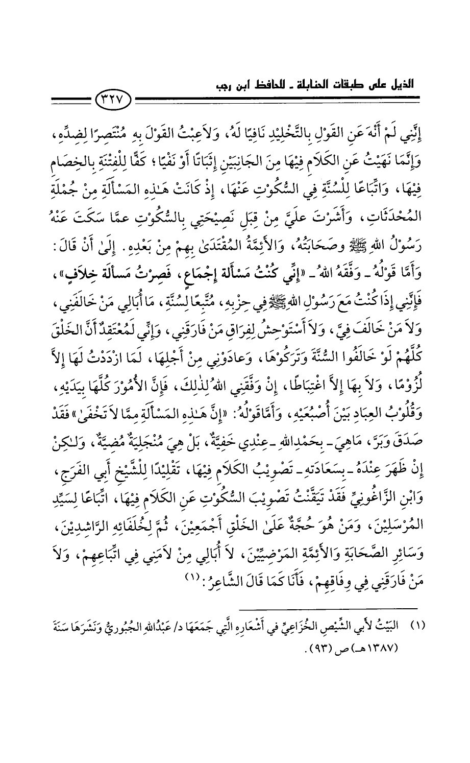 إنني لَمْ أنْه عَنِ القول بالتخليد نافت لَهُ، ولا عبت القول بِهِ منتصرا لضده. وإنما نهيت عَنِ الْكَلام فِيهَا من الجانبين إثباتا أَوْ نفيا، كَفّاً للفتنة بالخصام فِيهَا، واتباعا للسنة فِي السكوت عَنْهَا، إذ كانت هذه المسألة من جملة المحدثات، وأشرت عَلِي من قبل نصيحتي بالسكوت عما سكت عَنْهُ رَسُول اللَّه صَلَّى اللَّهُ عَلَيْهِ وَسَلَّمَ وصحابته، والأئمة المقتدى بهم من بعده - إِلَى أَن قَالَ - وَأَمَّا قَوْله - وفقه اللَّه - إني كنتُ مسألة إجماع، فصرت مسألة خلاف. فإنني إِذَا كنت مَعَ رَسُول اللَّه صَلَّى اللَّهُ عَلَيْهِ وَسَلَّمَ فِي حزبه، متبعا لسنته؛ مَا أبالي من خالفني، ولا من خالف فِي، ولا أستوحش لفراق من فارقني. وإني لمعتقد أَن الخلق كلهم لو خالفوا السنة وتركوها، وعادوني من أجلها، لما ازددت لَهَا إلا لزوما، ولا بها إلا اغتباطا، إِن وفقني اللَّه لِذَلِكَ. فَإِن الأمور كلها بيديه، وقلوب الْعِبَاد بَيْنَ إصبعيه. وَأَمَّا قَوْله: إِن هذه المسألة مِمَّا لا تخفى: فَقَدْ صدق وبر، مَا هِيَ بحمد اللَّه عندي خفية، بَل هِيَ منجلية مضية. ولكن إِن ظهر عنده بسعادته تصويب الْكَلام فِيهَا، تقليدا للشيخ أَبِي الفرج وابن. الزاغوني، فَقَدْ تيقنت تصويب السكوت عَنِ الْكَلام فِيهَا، اتباعا لسيد المرسلين، ومن هُوَ حجة عَلَى الخلق أجمعين، ثُمَّ لخلفائه الراشدين، وسائر الصَّحَابَة والأئمة المرضيين، لا أبالي من لامني فِي اتباعهم. ولا من فارقني فِي وفاقهم. فأنا كَمَا قَالَ الشاعر: