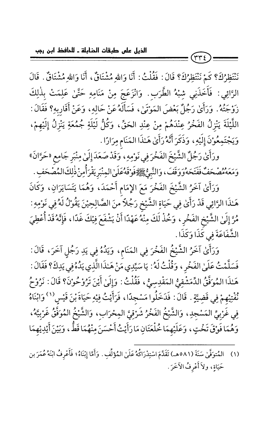 ننتظرك؟ كم ننتظرك؟ قَالَ: فَقُلْتُ: أنا والله مشتاق، أنا والله مشتاق. قَالَ الرائي: فأخذني شبه الطرب، وانزعج من منامه حَتَّى علمت بِذَلِكَ زوجته. ورأى رجل بَعْض الموتى. فسأله عَن حاله وعن أقاربه؟ فَقَالَ: الليلة ينزل الفخر عندهم من عِنْدَ الحق، وكل ليلة جُمعة ينزل إليهم، ويجتمعون إِلَيْهِ. وذكر أَنَّهُ رأى هَذَا المنام مرارا.
