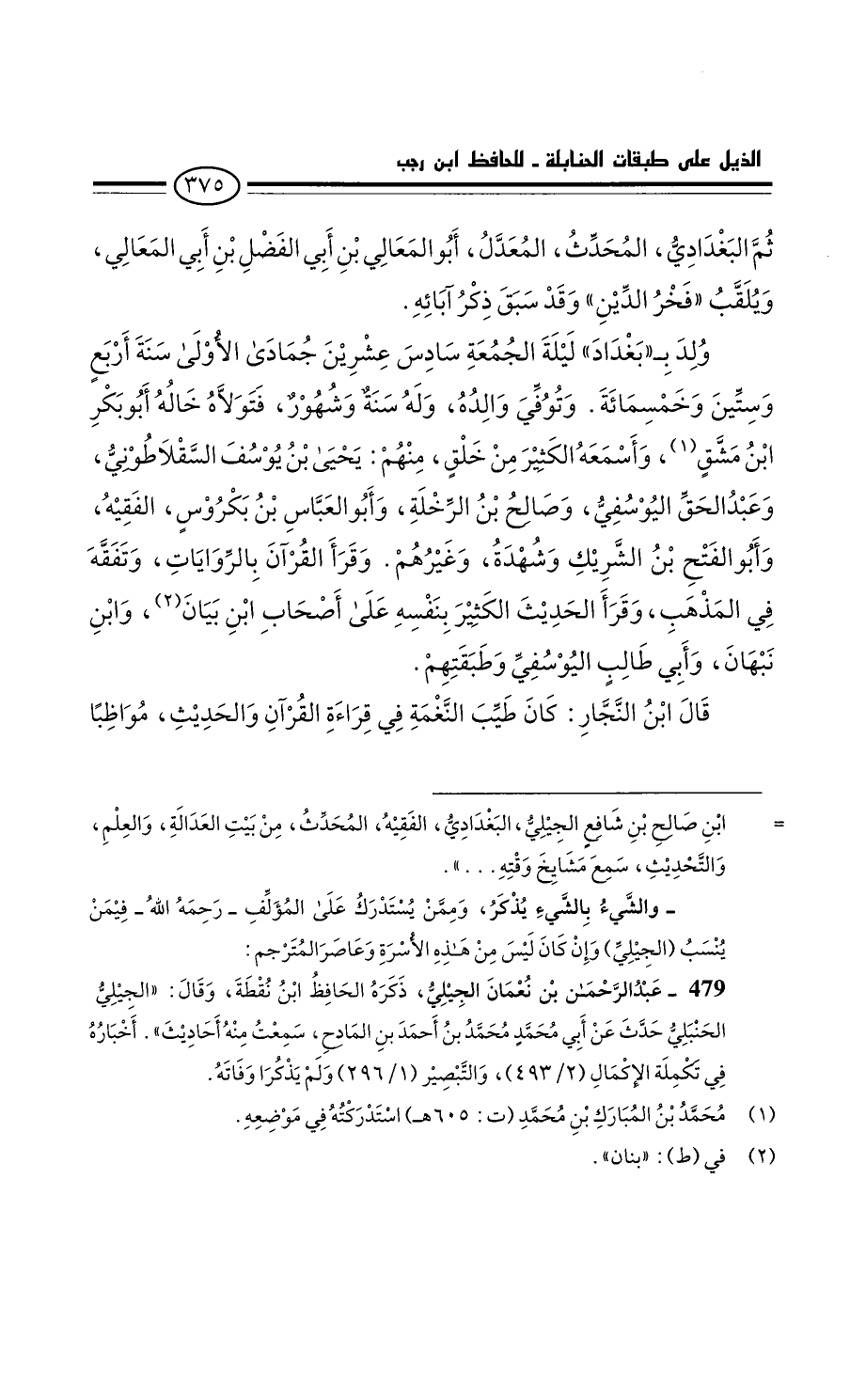 ثُمَّ البغدادي، المحدث المعدل، أَبُو المعالي بْن أَبِي الفضل بْن أَبِي المعالي. ويلقب فخر الدين: وَقَدْ سبق ذكر آبائه. ولد ببغداد ليلة الجمعة سادس عشرين جما! ى الأولى سنة أربع وستين وخمسمائة.