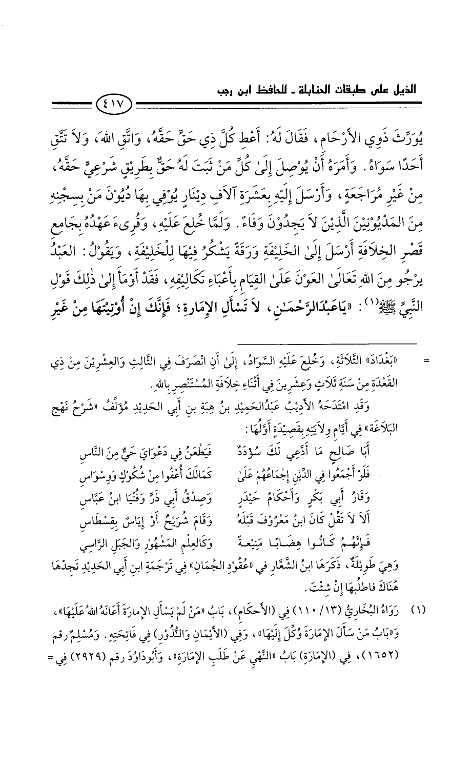 ولما خلع عَلَيْهِ، وقرئ عهده بجامع قصر الخلافة: أرسل إِلَى الخليفة ورقة يشكر فِيهَا للخليفة، وَيَقُول: العبد يرجو من اللَّه تَعَالَى العون عَلَى القيام بأعباء تكاليفه. فَقَدْ أومأ إِلَى ذَلِكَ قَوْل النَّبِي صَلَّى اللَّهُ عَلَيْهِ وَسَلَّمَ: " يا عَبْد الرَّحْمَنِ، لا تسال الإمارة؛ فإنك إِن أُوتيتها من غَيْر
