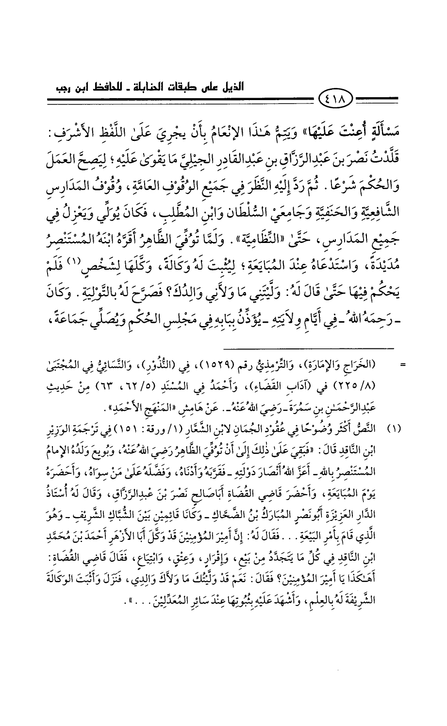 مسألة أعنت عَلَيْهَا ". ويتم هَذَا الإنعام بأن يجري عَلَى اللفظ الأشرف: قلدت نصر بْن عَبْد الرزاق بْن عَبْد القادر الجيلي مَا يقوى عَلَيْهِ؛ ليصح العمل والحكم شرعا.