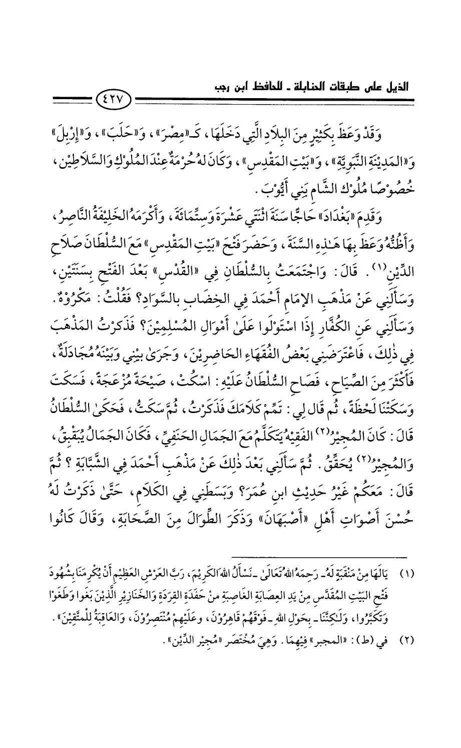 قَالَ: واجتمعت بالسلطان فِي القدس بَعْد الفتح بسنتين وسألني عَن مذهب الإمام أَحْمَد فِي الخضاب بالسواد؟ فَقُلْتُ: مكروه، وسألني عَنِ الكفار إِذَا استولوا عَلَى أَمْوَال الْمُسْلِمِينَ. فذكرت المذهب فِي ذلك. فاعترضتي بَعْض الْفُقَهَاء الحاضرين، وجرى بيني وبينه مجادلة، فأكثر من الصياح، فصاح السلطان عَلَيْهِ: اسكت، صيحة مزعجة، فسكت وسكتنا لحظة، ثُمَّ قَالَ لي: تَمِّمْ كلامك فذكرت، ثُمَّ سكت. فحكى السلطان قَالَ؛ كَانَ المجبر الفقيه يتكلم مَعَ الجمال الحنفي، فكان الجمال يبقبق، والمجبر يحقق. ثُمَّ سألني بَعْد ذَلِكَ عَن مذهب أَحْمَد فِي الشبابة؟ ثُمَّ قَالَ: معكم غَيْر حَدِيث ابْن عُمَر؟ وبسطني فِي الْكَلام، حَتَّى ذكرت لَهُ حسن أصوات أهل أصبهان. وذكر الطوال من الصَّحَابَة. وَقَالَ كَانُوا