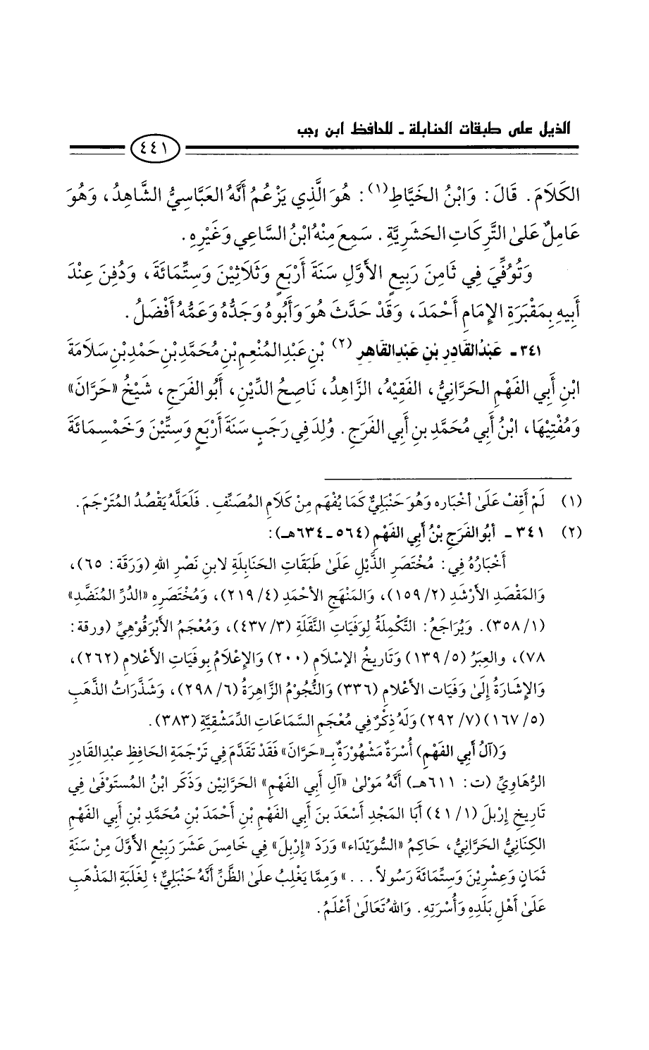 عَبْد القادر بْن عَبْد القاهر بْن عَبْد المنعم بْن مُحَمَّد بْن حمد بْن سلامة بْن أَبِي الفهم الحراني، الفقيه، الزاهد، ناصح الدين، أَبُو الفرج، شيخ حران ومفتيها، ابْن أَبِي مُحَمَّد بْن أَبِي الفرج: ولد فِي رجب سنة أربع وستين وخمسمائة
