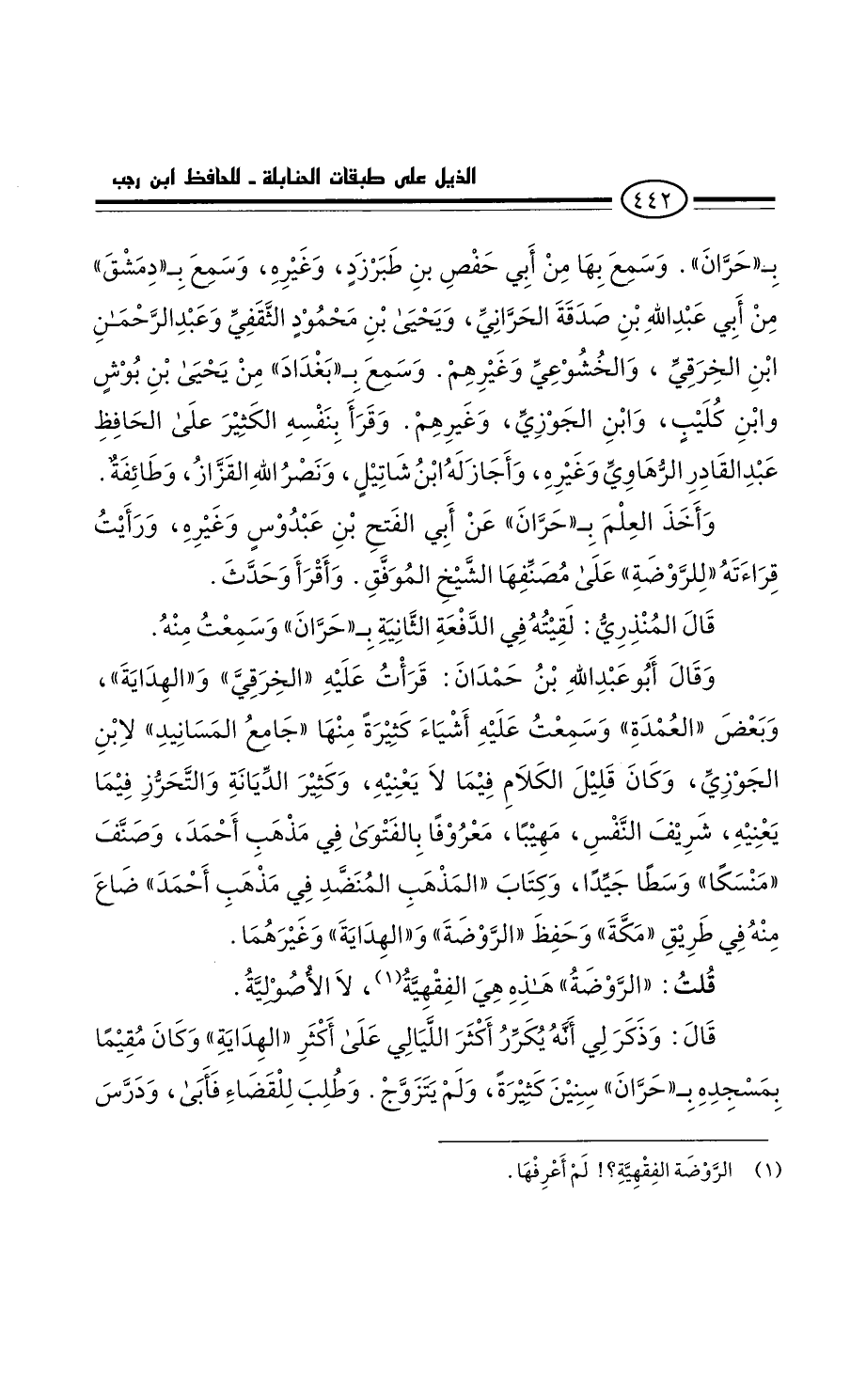 وأخذ العلم بحران عَن أَبِي الفتح بْن عبدوس وغيره. ورأيت قراءته للروضة على مصنفها الشيخ الموفق. وأقرأ وحدث.