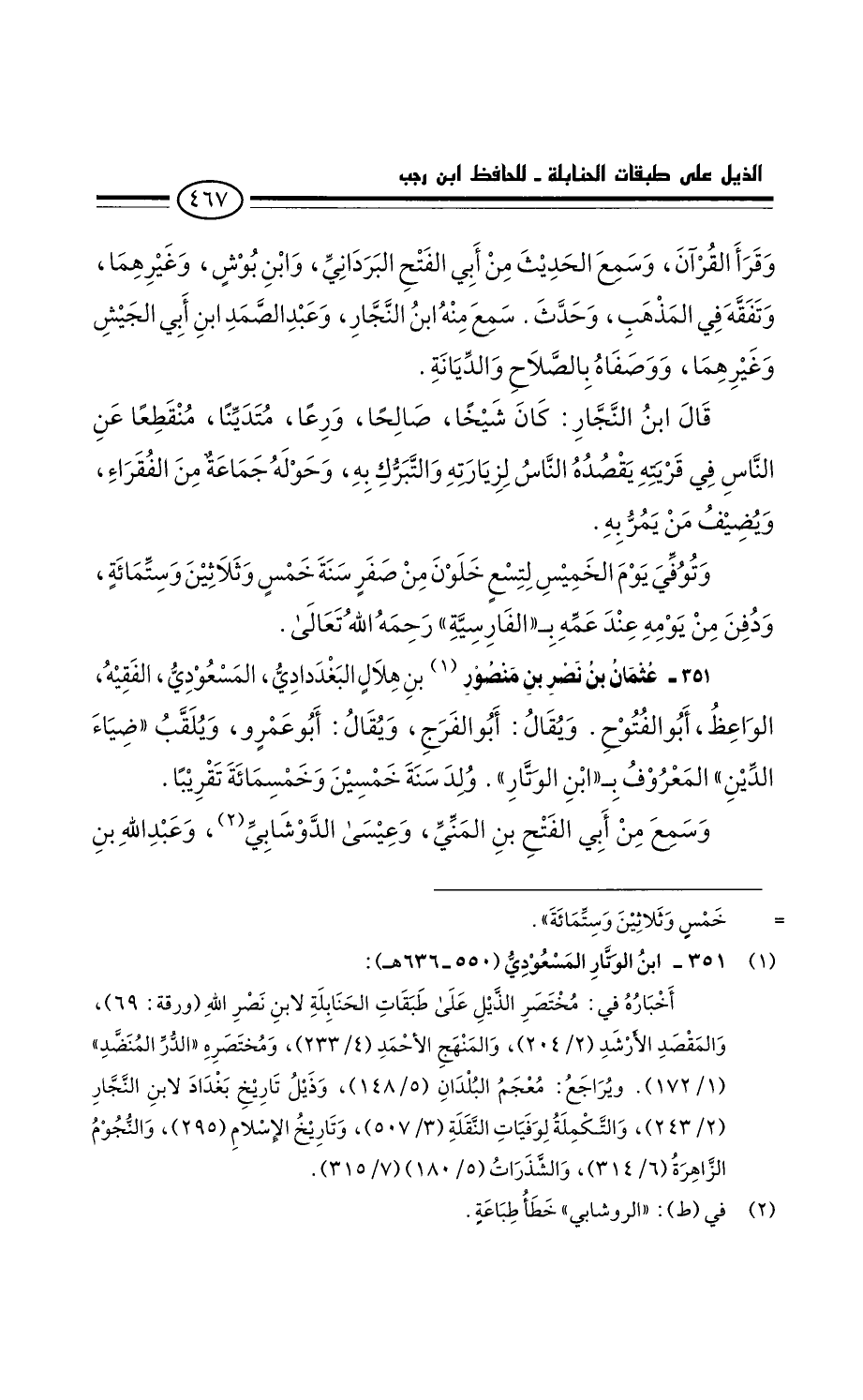 عُثْمَان بْن نصر بْن مَنْصُور بْن هلال البغدادي، المسعودي، الفقيه الواعظ، أَبُو الفتوح. ويقال: أَبُو الفرج. ويقال: أَبُو عَمْرو، ويلقب ضياء الدين المعروف بابن الوتار: ولد سنة خمسين وخمسمائة تقريبا.