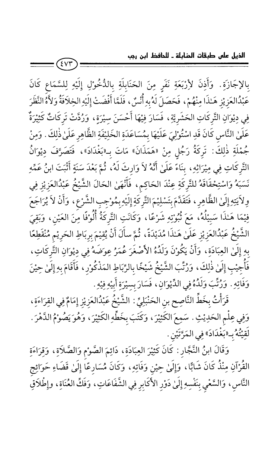 ومن جملة ذَلِكَ: تركة رجل من همدان مَات ببغداد، فتصرف ديوان التركات فِي ميراثه، بناء عَلَى أَنَّهُ لا وارث لَهُ، ثُمَّ بَعْد سنة أثبت ابْن عمه نسبه واستحقاقه للتركة عِنْدَ الحاكم. فأنهى الحال الشيخ عَبْد الْعَزِيز فِي ولايته إِلَى الظاهر، فتقدم بتسليم التركة إليه بموجب الشرع، وأن لا يراجع فيما هذا سبيله، مع ثبوته شرعاً. وكانت التركة ألوفاً من العين، ولقي الشيخ عَبْد الْعَزِيز عَلَى هَذَا مديدة. ثُمَّ سأل أَن يقيم برباط الحريم منقطعا بِهِ إِلَى العبادة، وأن يَكُون ولده الأصغر عُمَر عوضه فِي ديوان التركات. فأجيب إِلَى ذَلِكَ. ورتب الشيخ شيخا بالرباط المذكور، فأقام بِهِ إِلَى حِينَ وفاته. ورتب ولده فِي الديوان فسار بسيرة أَبِيهِ فِيهِ.