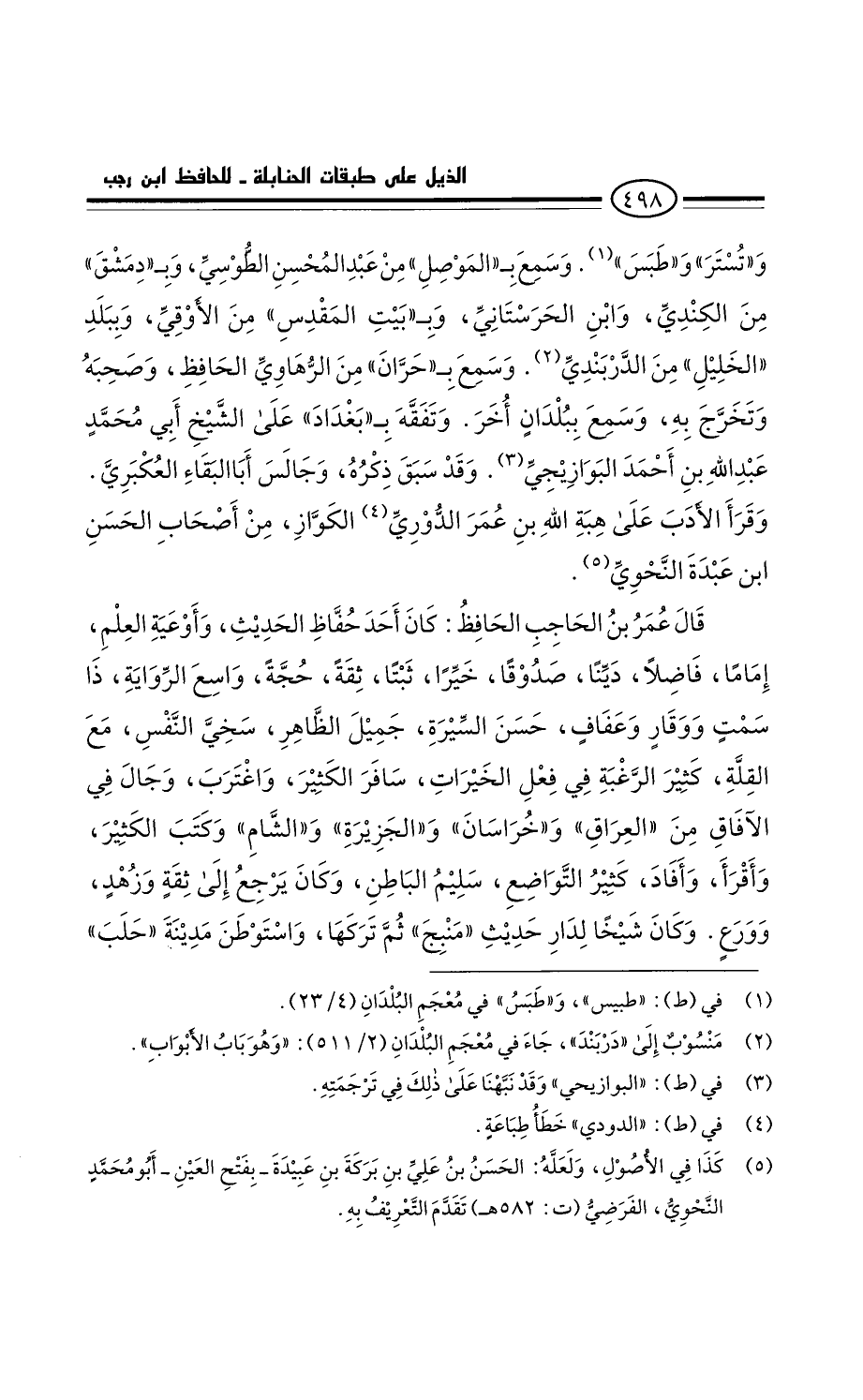 قَالَ عُمَر بْن الحاجب الحافظ: كان أحد حفاظ الحديث، وأوعية العلم، إماما فاضلا دينا صدوقا خيرا، ثبتا ثقة حجة، واسع الرواية، ذا سمت ووقار وعفاف، حسن السيرة. جميل الظاهر، سخي النفس مَعَ القلة، كثير الرغبة فِي فعل الخيرات. سافر الكثير، واغترب، وجال فِي الآفاق من العراق، وخراسان، والجزيرة والشام. وكتب الكثير، وأقرأ وأفاد، كثير التواضع، سليم الباطن. وَكَانَ يرجع إِلَى ثقة وزهد وورع.