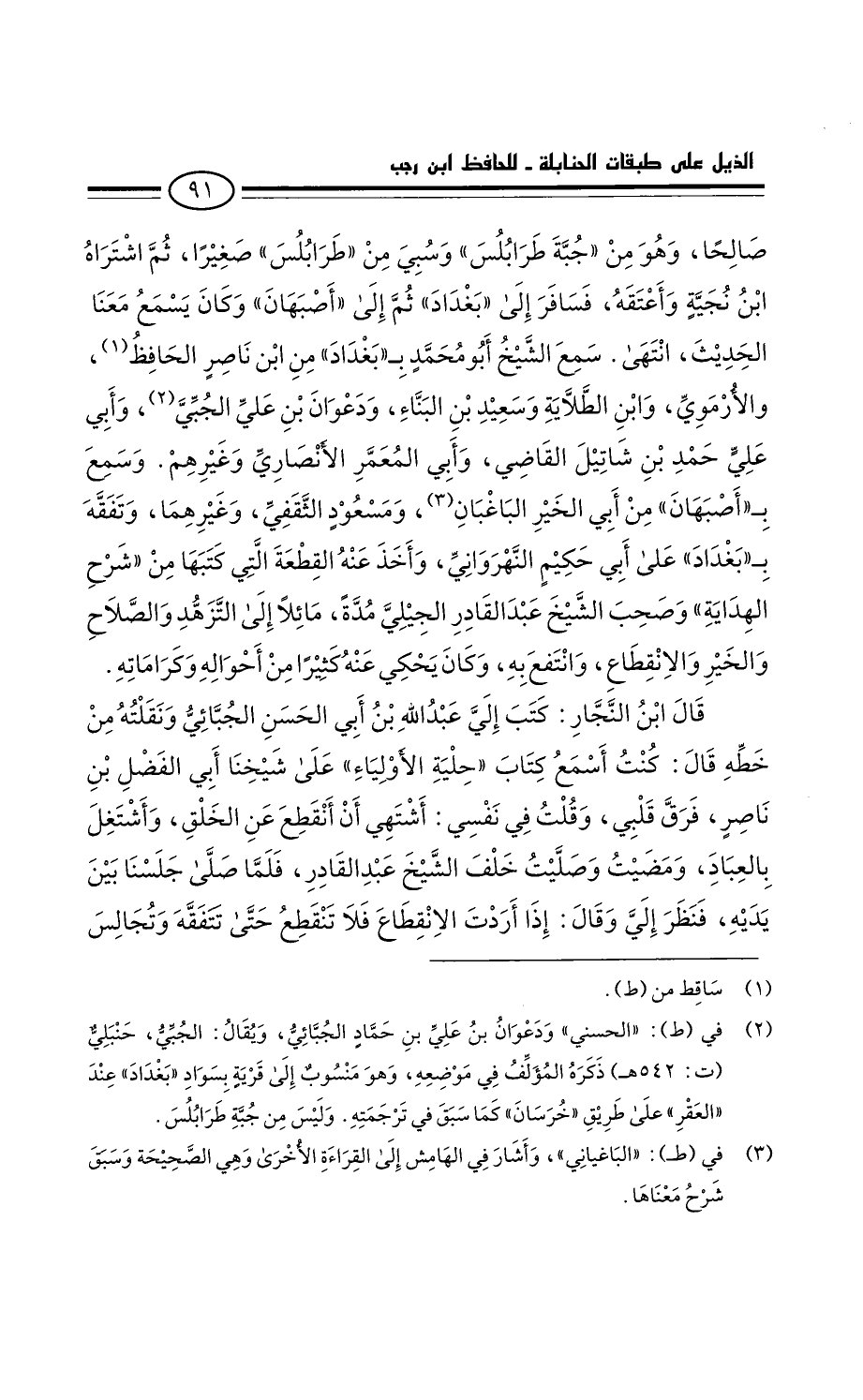 قَالَ ابْن النجار: كتب إِلَى عبد الله بن أبي الحسن الجبائي ونقلته من خطه قَالَ: كنت أسمع كتاب " حلية الأولياء " عَلَى شيخنا أَبِي الفضل بْن ناصر، فرق قلبي، وقلت فِي نفسي: أشتهي أَن أنقطع عَنِ الخلق وأشتغل بالعبادة، ومضيت وصليت خلف الشيخ عَبْد القادر فلما صلى جلسنا بَيْنَ يديه فنظر غلي وَقَالَ: إِذَا أردت الانقطاع فلا تنقطع حَتَّى تتفقه وتجالس