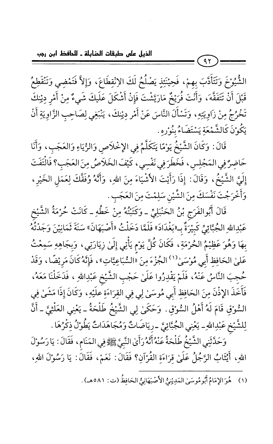 قَالَ أَبُو الفرج بْن الحنبلي - وكتبته من خطه -: كانت حرمة الشيخ عَبْد اللَّهِ الجبائي كبيرة ببغداد. فلما دخلت أصبهان سنة ثمانين وجدته فِيهَا وَهُوَ عظيم الحرمة، فكان كُل يَوْم يَأْتِي إِلَى زيارتي. وبجاهه سمعت عَلَى الحافظ أَبِي موسى الجزء من السباعيات، فَإِنَّهُ كَانَ مريضا. وَقَدْ حجب النَّاس عَنْهُ، فلم يقدروا عَلَى حجب الشيخ عَبْد اللَّهِ، فدخلنا مَعَهُ، فأخذ الإذن من الحافظ أَبِي موسى لي فِي القراءة عَلَيْهِ. وَكَانَ إِذَا مشى فِي السوق قام لَهُ أهل السوق. وحكى لي الشيخ طَلْحَة - يَعْنِي العلثي - أن للشيخ عبد الله - يعني الجبائي - رياضات ومجاهدات يطول ذكرها.
