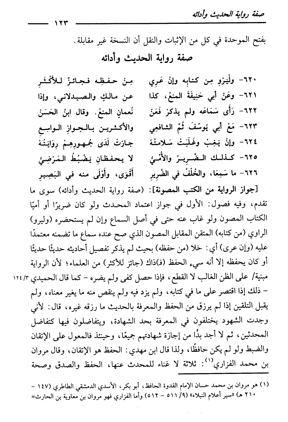 (صِفَةُ رِوَايَةِ الْحَدِيثِ وَأَدَائِهِ) سِوَى مَا تَقَدَّمَ، وَفِيهِ فُصُولٌ: الْأَوَّلُ فِي جَوَازِ اعْتِمَادِ الْمُحَدِّثِ وَلَوْ كَانَ ضَرِيرًا أَوْ أُمِّيًّا الْكِتَابَ الْمَصُونَ، وَلَوْ غَابَ عَنْهُ حَتَّى فِي أَصْلِ السَّمَاعِ وِإِنْ لَمْ يَسْتَحْضِرْهُ.