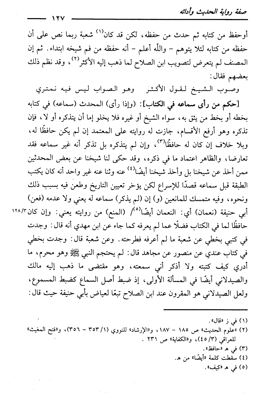 أَوْ حَفِظَ مِنْ كِتَابِهِ ثُمَّ حَدَّثَ مِنْ حِفْظِهِ، لَكِنْ قَدْ كَانَ شُعْبَةُ رُبَّمَا نَصَّ عَلَى أَنَّ حِفْظَهُ مِنْ كِتَابِهِ لِئَلَّا يُتَوَهَّمَ - وَاللَّهُ أَعْلَمُ - أَنَّهُ حَفِظَهُ مِنْ فَمِ شَيْخِهِ ابْتِدَاءً. ثُمَّ إِنَّ الْمُصَنِّفَ لَمْ يَتَعَرَّضْ لِتَصْوِيبِ ابْنِ الصَّلَاحِ لِمَا ذَهَبَ إِلَيْهِ الْأَكْثَرُ، وَقَدْ نَظَمَ ذَلِكَ بَعْضُهُمْ فَقَالَ: