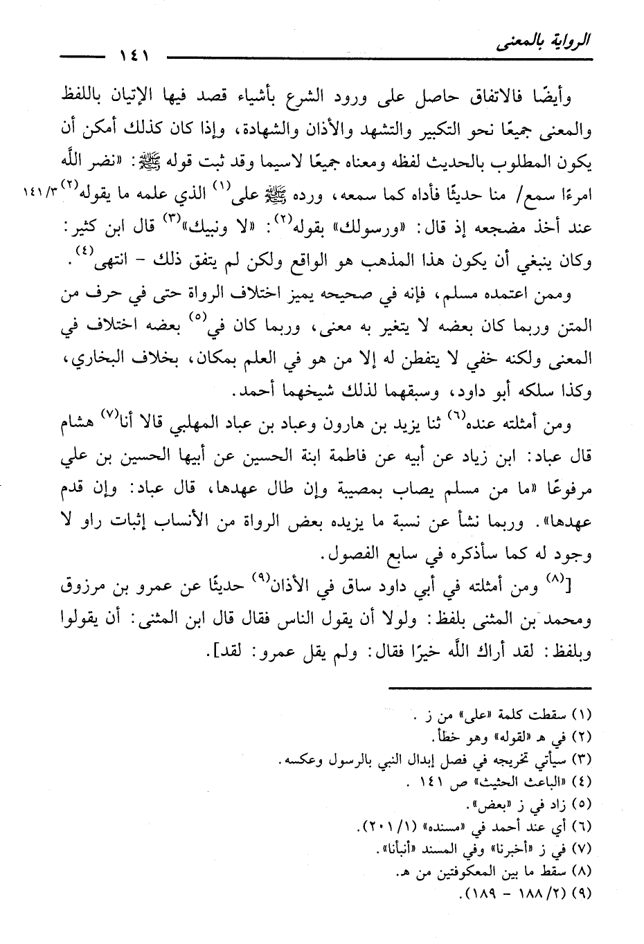 وَأَيْضًا فَالِاتِّفَاقُ حَاصِلٌ عَلَى وُرُودِ الشَّرْعِ بِأَشْيَاءَ قَصَدَ فِيهَا الْإِتْيَانَ بِاللَّفْظِ وَالْمَعْنَى جَمِيعًا، نَحْوَ التَّكْبِيرِ وَالتَّشَهُّدِ وَالْأَذَانِ وَالشَّهَادَةِ، وَإِذَا كَانَ كَذَلِكَ أَمْكَنَ أَنْ يَكُونَ الْمَطْلُوبُ بِالْحَدِيثِ لَفْظَهُ وَمَعْنَاهُ جَمِيعًا، لَا سِيَّمَا وَقَدْ ثَبَتَ قَوْلُهُ صَلَّى اللَّهُ عَلَيْهِ وَسَلَّمَ: ( «نَضَّرَ اللَّهُ امْرَءًا سَمِعَ مِنَّا حَدِيثًا فَأَدَّاهُ كَمَا سَمِعَهُ» ) . «وَرَدُّهُ صَلَّى اللَّهُ عَلَيْهِ وَسَلَّمَ عَلَى الَّذِي عَلَّمَهُ مَا يَقُولُهُ عِنْدَ أَخْذِ مَضْجَعِهِ إِذْ قَالَ: وَ " رَسُولِكَ " بِقَوْلِهِ: " لَا، وَنَبِيِّكَ» . قَالَ ابْنُ كَثِيرٍ: وَكَانَ يَنْبَغِي أَنْ يَكُونَ هَذَا الْمَذْهَبُ هُوَ الْوَاقِعَ، وَلَكِنْ لَمْ يَتِّفِقْ ذَلِكَ. انْتَهَى.
