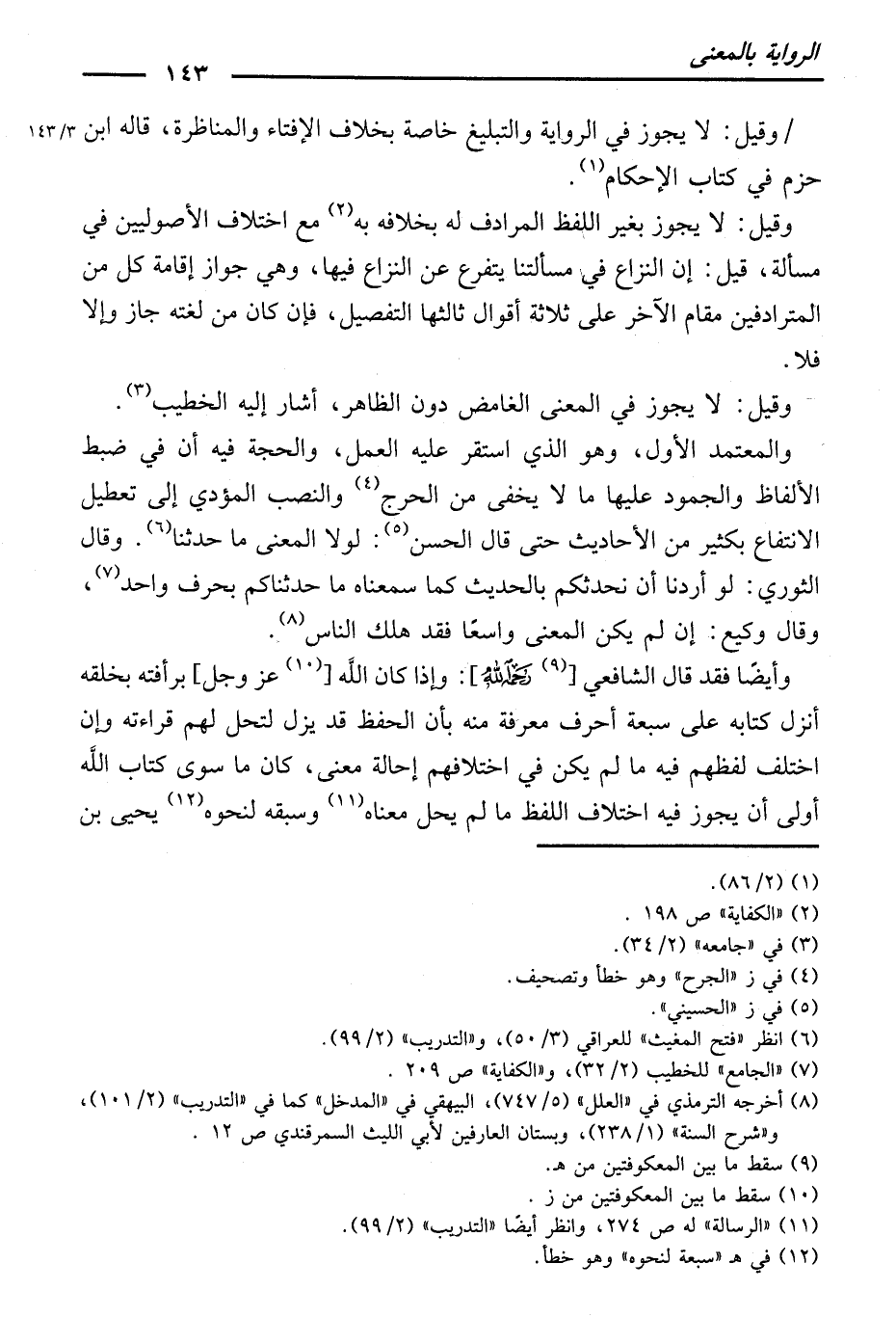 وَأَيْضًا فَقَدْ قَالَ الشَّافِعِيُّ رَحِمَهُ اللَّهُ: وَإِذَا كَانَ اللَّهُ عَزَّ وَجَلَّ بِرَأْفَتِهِ بِخَلْقِهِ أَنْزَلَ كِتَابَهُ عَلَى سَبْعَةِ أَحْرُفٍ مَعْرِفَةً مِنْهُ بِأَنَّ الْحِفْظَ قَدْ يَزِلُّ، لِتَحِلَّ لَهُمْ قِرَاءَتُهُ وَإِنِ اخْتَلَفَ لَفْظُهُمْ فِيهِ، مَا لَمْ يَكُنْ فِي اخْتِلَافِهِمْ إِحَالَةُ مَعْنًى، كَانَ مَا سِوَى كِتَابِ اللَّهِ أَوْلَى أَنْ يَجُوزَ فِيهِ اخْتِلَافُ اللَّفْظِ مَا لَمْ يُحِلْ مَعْنَاهُ.