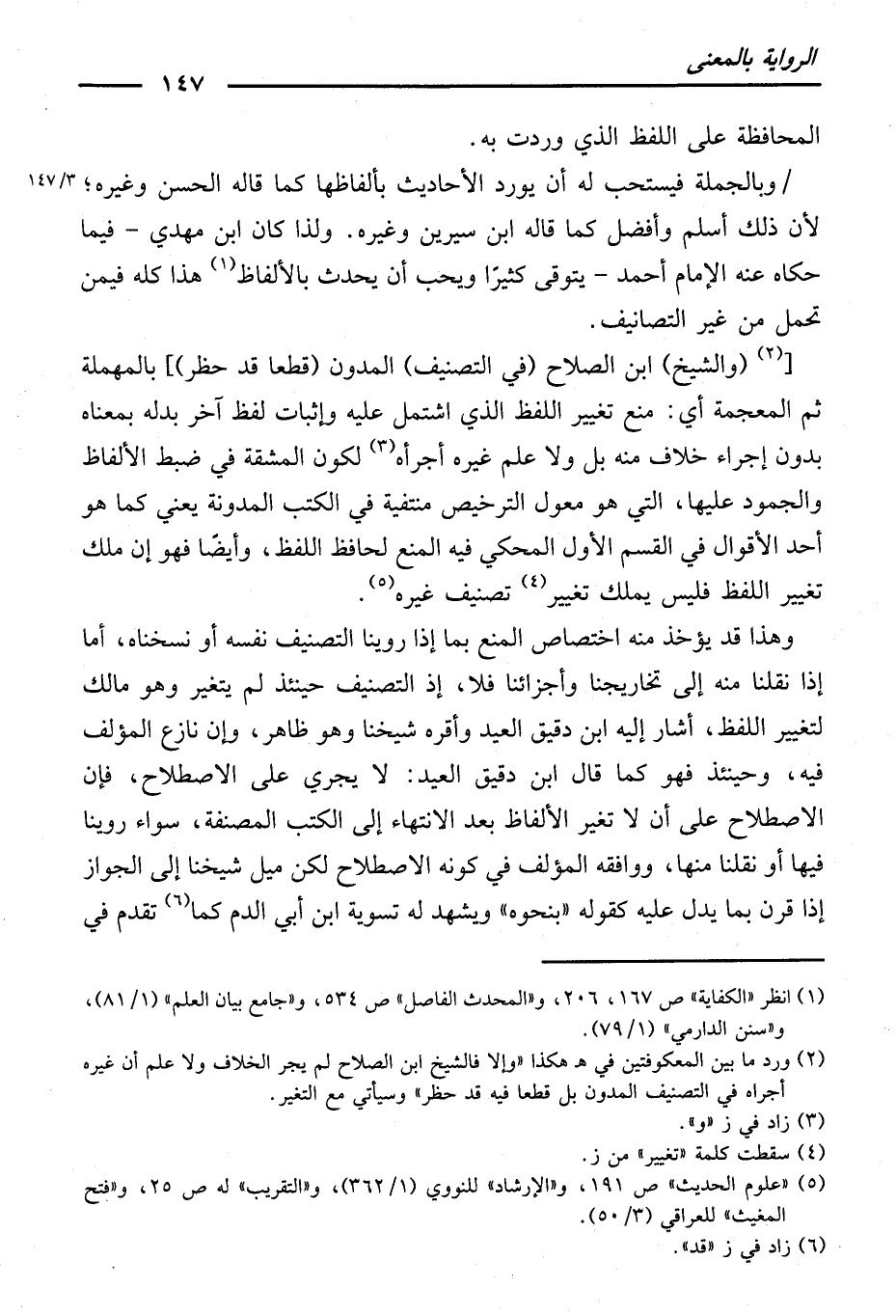 وَهَذَا قَدْ يُؤْخَذُ مِنْهُ اخْتِصَاصُ الْمَنْعِ بِمَا إِذَا رَوَيْنَا التَّصْنِيفَ نَفْسَهُ أَوْ نَسَخْنَاهُ، أَمَّا إِذَا نَقَلْنَا مِنْهُ إِلَى تَخَارِيجِنَا وَأَجْزَائِنَا فَلَا، إِذِ التَّصْنِيفُ حِينَئِذٍ لَمْ يَتَغَيَّرْ، وَهُوَ مَالِكٌ لِتَغْيِيرِ اللَّفْظِ. أَشَارَ إِلَيْهِ ابْنُ دَقِيقِ الْعِيدِ، وَأَقَرَّهُ شَيْخُنَا، وَهُوَ ظَاهِرٌ وَإِنْ نَازَعَ الْمُؤَلِّفُ فِيهِ، وَحِينَئِذٍ فَهُوَ كَمَا قَالَ ابْنُ دَقِيقِ الْعِيدِ: لَا يَجْرِي عَلَى الِاصْطِلَاحِ، فَإِنَّ الِاصْطِلَاحَ عَلَى أَنْ لَا تُغَيَّرَ الْأَلْفَاظُ بَعْدَ الِانْتِهَاءِ إِلَى الْكُتُبِ الْمُصَنَّفَةِ، سَوَاءٌ رَوَيْنَا فِيهَا أَوْ نَقَلْنَا مِنْهَا.