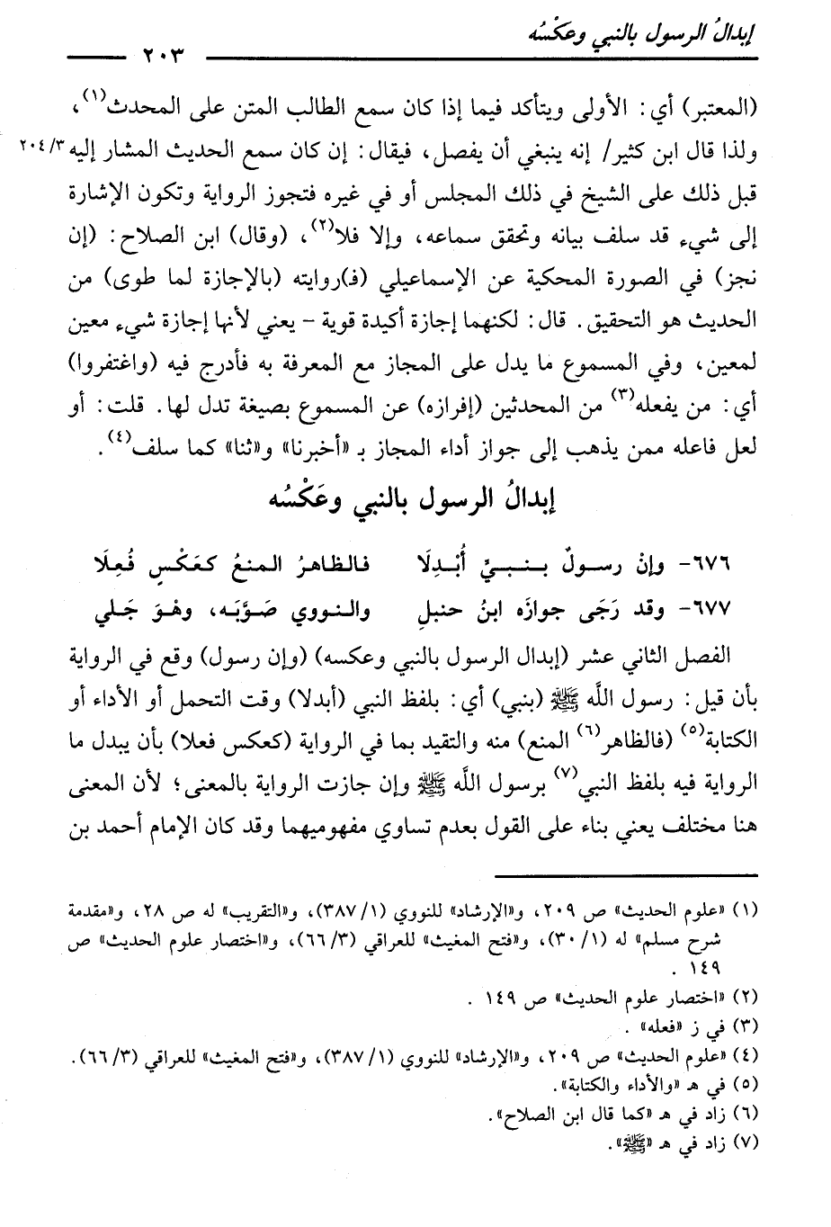 (وَإِنْ رَسُولٌ) وَقَعَ فِي الرِّوَايَةِ بِأَنْ قِيلَ: رَسُولُ اللَّهِ صَلَّى اللَّهُ عَلَيْهِ وَسَلَّمَ (بِنَبِيٍّ) أَيْ: بِلَفْظِ النَّبِيِّ (أُبْدِلَا) وَقْتَ التَّحَمُّلِ أَوِ الْأَدَاءِ أَوِ الْكِتَابَةِ، (فَالظَّاهِرُ الْمَنْعُ) مِنْهُ، وَالتَّقَيُّدُ بِمَا فِي الرِّوَايَةِ (كَعَكْسٍ فُعِلَا) بِأَنْ يُبْدَلَ مَا الرِّوَايَةُ فِيهِ بِلَفْظِ النَّبِيِّ بِرَسُولِ اللَّهِ صَلَّى اللَّهُ عَلَيْهِ وَسَلَّمَ، وَإِنْ جَازَتِ الرِّوَايَةُ بِالْمَعْنَى ; لِأَنَّ الْمَعْنَى هُنَا مُخْتَلِفٌ. يَعْنِي بِنَاءً عَلَى الْقَوْلِ بِعَدَمِ تَسَاوِي مَفْهُومَيْهِمَا.