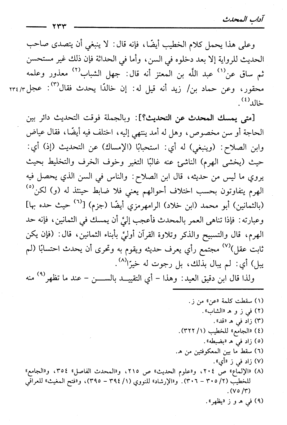 وَعَلَى هَذَا يُحْمَلُ كَلَامُ الْخَطِيبِ أَيْضًا فَإِنَّهُ قَالَ: لَا يَنْبَغِي أَنْ يَتَصَدَّى صَاحِبُ الْحَدِيثِ لِلرِّوَايَةِ إِلَّا بَعْدَ دُخُولِهِ فِي السِّنِّ، وَأَمَّا فِي الْحَدَاثَةِ فَإِنَّ ذَلِكَ غَيْرُ مُسْتَحْسَنٍ. ثُمَّ سَاقَ عَنْ عَبْدِ اللَّهِ بْنِ الْمُعْتَزِّ أَنَّهُ قَالَ: جَهْلُ الشَّبَابِ مَعْذُورٌ، وَعِلْمُهُ مَحْقُورٌ. وَعَنْ حَمَّادِ بْنِ زَيْدٍ أَنَّهُ قِيلَ لَهُ: إِنَّ خَالِدًا يُحَدِّثُ، فَقَالَ: عَجِلَ خَالِدٌ.