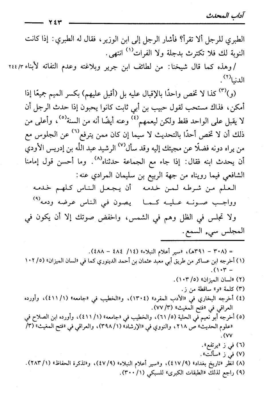 وَعَنْهُ أَيْضًا أَنَّهُ مِنَ السُّنَّةِ. وَأَعْلَى مِنْ ذَلِكَ أَلَّا تَخُصَّ أَحَدًا بِالتَّحْدِيثِ، لَا سِيَّمَا إِنْ كَانَ مِمَّنْ يَتَرَفَّعُ عَنِ الْجُلُوسِ مَعَ مَنْ يَرَاهُ دُونَهُ، فَضْلًا عَنْ مَجِيئِكَ إِلَيْهِ، وَقَدْ سَأَلَ الرَّشِيدُ عَبْدَ اللَّهِ بْنَ إِدْرِيسَ الْأَوْدِيَّ أَنْ يُحَدِّثَ ابْنَهُ فَقَالَ: إِذَا جَاءَ مَعَ الْجَمَاعَةِ حَدَّثْنَاهُ. وَمَا أَحْسَنَ قَوْلَ إِمَامِنَا الشَّافِعِيِّ فِيمَا رُوِّينَاهُ مِنْ جِهَةِ الرَّبِيعِ بْنِ سُلَيْمَانَ الْمُرَادِيِّ عَنْهُ: