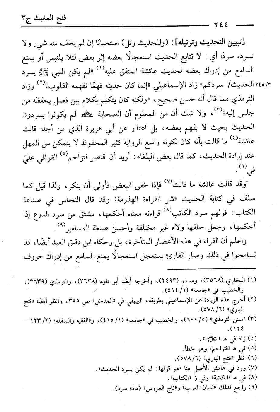 [تَبْيِينُ التَّحْدِيثِ وَتَرْتِيلُهُ] : (وَلِلْحَدِيثِ رَتِّلِ) اسْتِحْبَابًا إِنْ لَمْ يُخَفْ مِنْهُ شَيْءٌ، وَلَا تَسْرُدْهُ سَرْدًا، أَيْ لَا تُتَابِعِ الْحَدِيثَ اسْتِعْجَالًا، بَعْضَهُ إِثْرَ بَعْضٍ ; لِئَلَّا يَلْتَبِسَ أَوْ يَمْنَعَ السَّامِعَ مِنْ إِدْرَاكِ بَعْضِهِ ; لِحَدِيثِ عَائِشَةَ الْمُتَّفَقِ عَلَيْهِ: ( «لَمْ يَكُنِ النَّبِيُّ صَلَّى اللَّهُ عَلَيْهِ وَسَلَّمَ يَسْرُدُ الْحَدِيثَ سَرْدَكُمْ» ) .