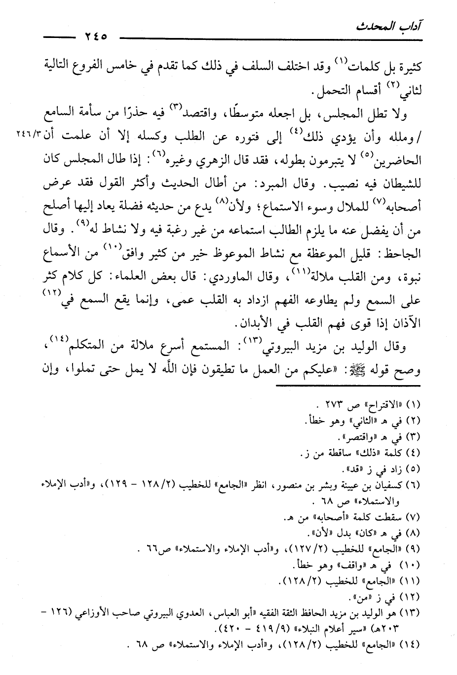 وَقَالَ الْوَلِيدُ بْنُ مَزِيدٍ الْبَيْرُوتِيُّ: الْمُسْتَمِعُ أَسْرَعُ مَلَالَةً مِنَ الْمُتَكَلِّمِ، وَصَحَّ قَوْلُهُ صَلَّى اللَّهُ عَلَيْهِ وَسَلَّمَ: ( «عَلَيْكُمْ مِنَ الْعَمَلِ مَا تُطِيقُونَ، فَإِنَّ اللَّهَ لَا يَمَلُّ حَتَّى تَمَلُّوا، وَإِنَّ