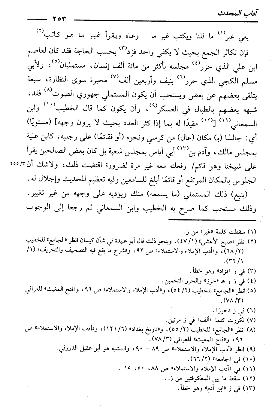 فَإِنْ تَكَاثَرَ الْجَمْعُ بِحَيْثُ لَا يَكْفِي وَاحِدٌ، فَزِدْ بِحَسَبِ الْحَاجَةِ، فَقَدْ كَانَ لِعَاصِمِ بْنِ عَلِيٍّ الَّذِي حُزِرَ مَجْلِسُهُ بِأَكْثَرَ مِنْ مِائَةِ أَلْفِ إِنْسَانٍ، مُسْتَمْلِيَانِ. وَلِأَبِي مُسْلِمٍ الْكَجِّيِّ الَّذِي حُزِرَ بِنَيِّفٍ وَأَرْبَعِينَ أَلْفَ مَحْبَرَةٍ سِوَى النَّظَّارَةِ، سَبْعَةٌ يَتَلَقَّى بَعْضُهُمْ عَنْ بَعْضٍ.