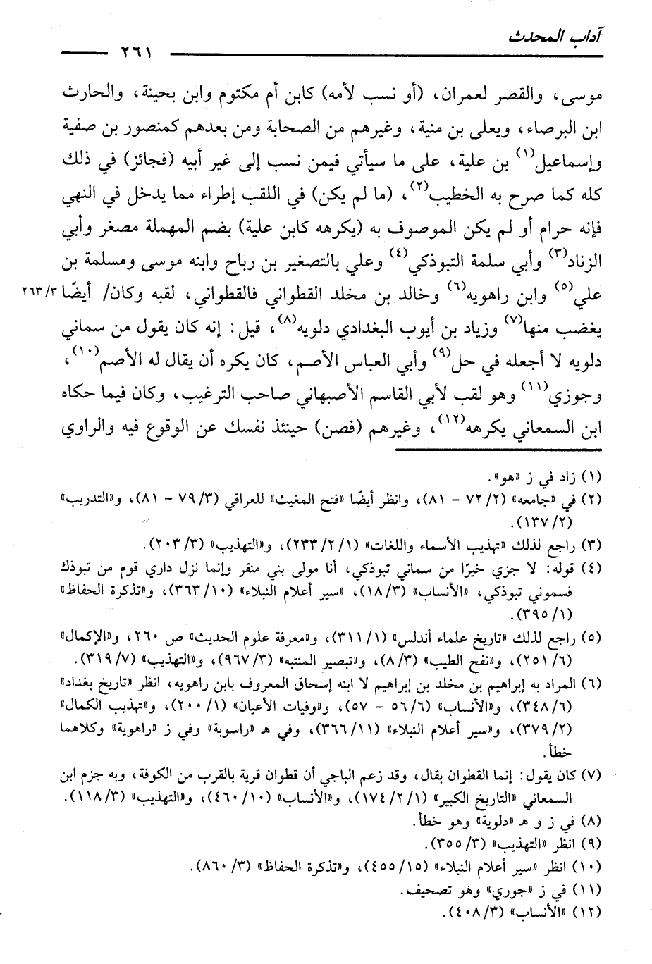 وَأَبِي الْعَبَّاسِ الْأَصَمِّ كَانَ يَكْرَهُ أَنْ يُقَالَ لَهُ: الْأَصَمُّ. وَجُوزِيٍّ، وَهُوَ لَقَبٌ لِأَبِي الْقَاسِمِ الْأصْبَهَانِيِّ صَاحِبِ (التَّرْغِيبِ) ، وَكَانَ فِيمَا حَكَاهُ ابْنُ السَّمْعَانِيِّ يَكْرَهُهُ، وَغَيْرِهِمْ (فَصُنْ) حِينَئِذٍ نَفْسَكَ عَنِ الْوُقُوعِ فِيهِ وَالرَّاوِيَ
