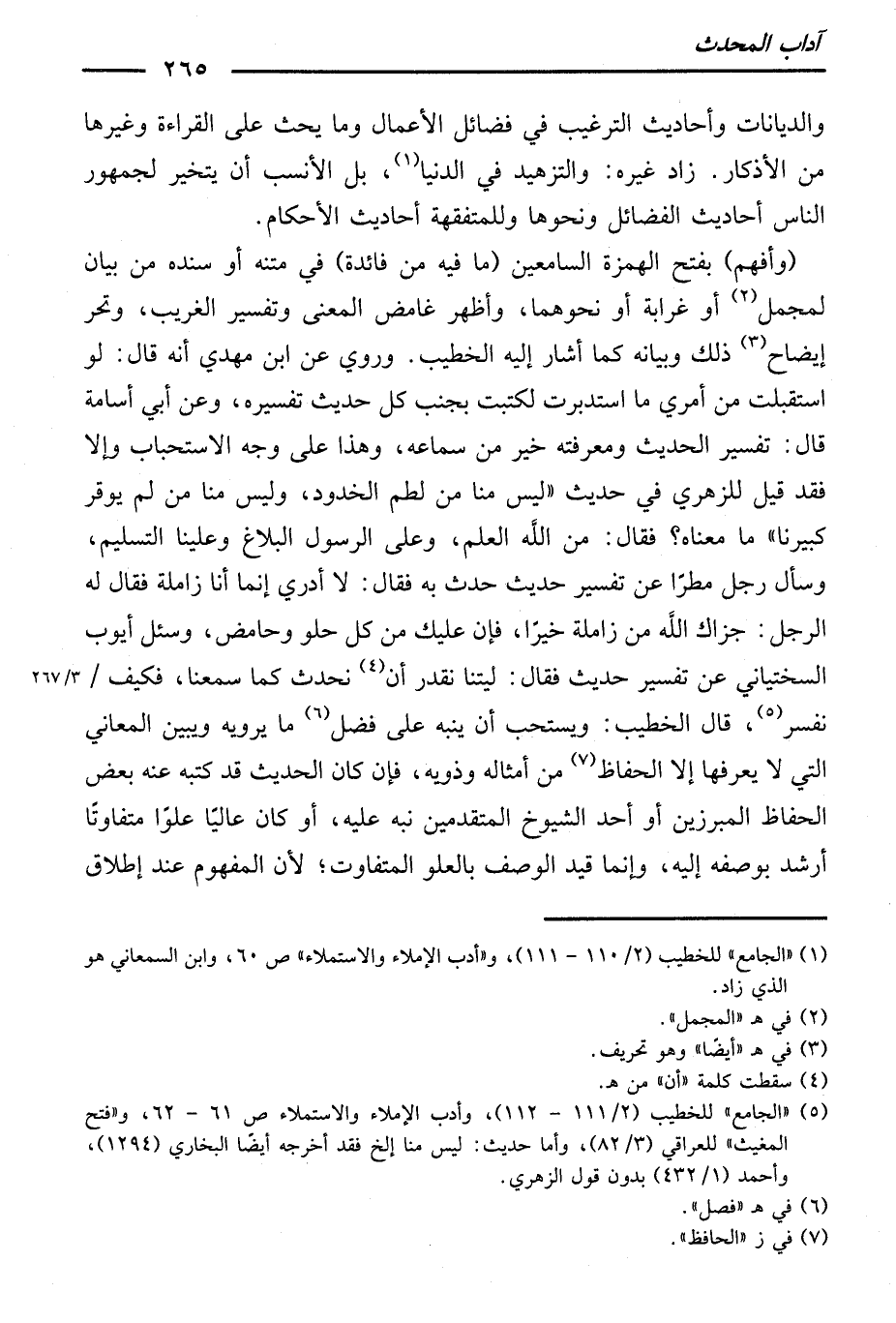 وَسُئِلَ أَيُّوبُ السِّخْتِيَانِيُّ عَنْ تَفْسِيرِ حَدِيثٍ، فَقَالَ: لَيْتَنَا نَقْدِرُ أَنْ نُحَدِّثَ كَمَا سَمِعْنَا، فَكَيْفَ نُفَسِّرُ؟ ! قَالَ الْخَطِيبُ: وَيُسْتَحَبُّ أَنْ يُنَبِّهَ عَلَى فَضْلِ مَا يَرْوِيهِ، وَيُبَيِّنَ الْمَعَانِيَ الَّتِي لَا يَعْرِفُهَا إِلَّا الْحُفَّاظُ مِنْ أَمْثَالِهِ وَذَوِيهِ، فَإِنْ كَانَ الْحَدِيثُ قَدْ كَتَبَهُ عَنْهُ بَعْضُ الْحُفَّاظِ الْمُبَرَّزِينَ، أَوْ أَحَدُ الشُّيُوخِ الْمُتَقَدِّمِينَ، نَبَّهَ عَلَيْهِ، أَوْ كَانَ عَالِيًا عُلُوًّا مُتَفَاوِتًا أَرْشَدَ بِوَصْفِهِ إِلَيْهِ.
