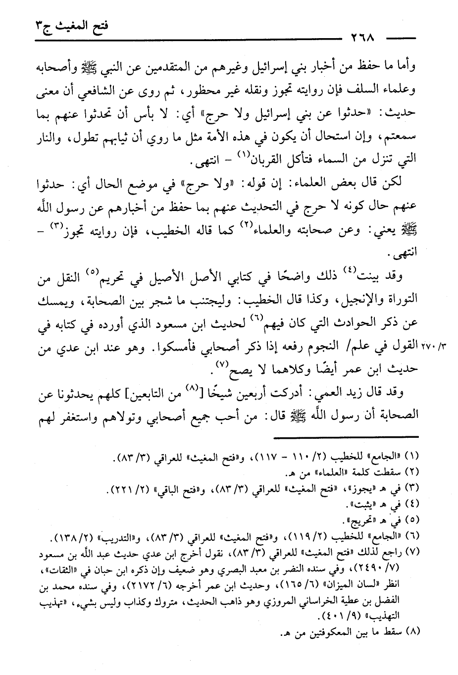 وَأَمَّا مَا حُفِظَ مِنْ أَخْبَارِ بَنِي إِسْرَائِيلَ وَغَيْرِهِمْ مِنَ الْمُتَقَدِّمِينَ عَنِ النَّبِيِّ صَلَّى اللَّهُ عَلَيْهِ وَسَلَّمَ وَأَصْحَابِهِ وَعُلَمَاءِ السَّلَفِ، فَإِنَّ رِوَايَتَهُ تَجُوزُ، وَنَقْلَهُ غَيْرُ مَحْظُورٍ.