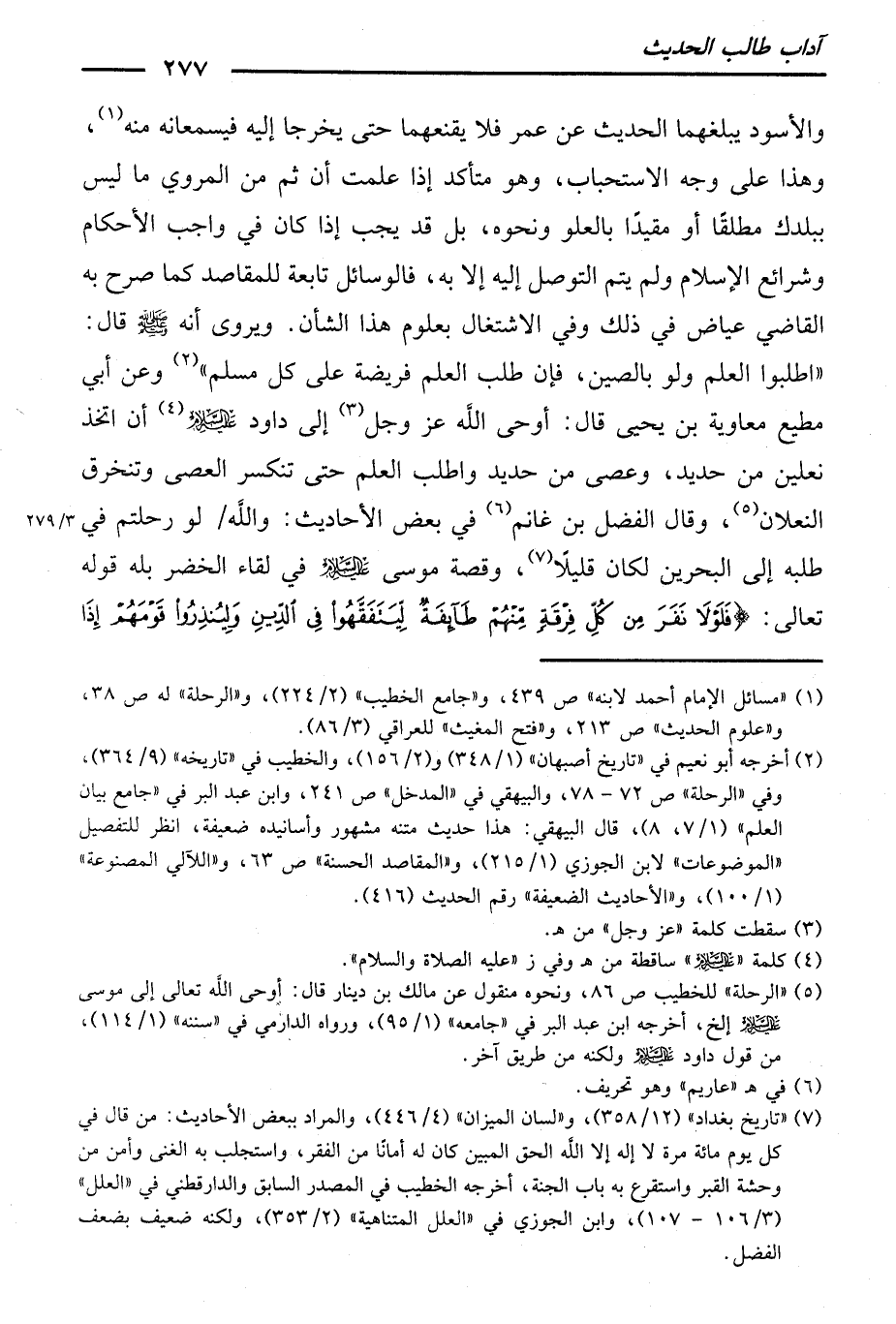 وَقَالَ الْفَضْلُ بْنُ غَانِمٍ فِي بَعْضِ الْأَحَادِيثِ: وَاللَّهِ لَوْ رَحَلْتُمْ فِي طَلَبِهِ إِلَى الْبَحْرَيْنِ لَكَانَ قَلِيلًا. وَقِصَّةُ مُوسَى عَلَيْهِ السَّلَامُ فِي لِقَاءِ الْخَضِرِ، بَلْ قَوْلُهُ تَعَالَى: {فَلَوْلَا نَفَرَ مِنْ كُلِّ فِرْقَةٍ مِنْهُمْ طَائِفَةٌ لِيَتَفَقَّهُوا فِي الدِّينِ وَلِيُنْذِرُوا قَوْمَهُمْ إِذَا رَجَعُوا إِلَيْهِمْ لَعَلَّهُمْ يَحْذَرُونَ} [التوبة: 122]