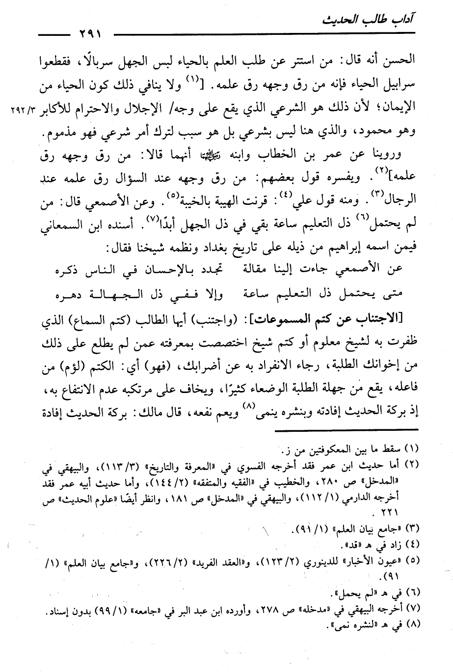 وَرُوِّينَا عَنْ عُمَرَ بْنِ الْخَطَّابِ وَابْنِهِ رَضِيَ اللَّهُ عَنْهُمَا، أَنَّهُمَا قَالَا: مَنْ رَقَّ وَجْهُهُ رَقَّ عِلْمُهُ. وَيُفَسِّرُهُ قَوْلُ بَعْضِهِمْ: مَنْ رَقَّ وَجْهُهُ عِنْدَ السُّؤَالِ رَقَّ عِلْمُهُ عِنْدَ الرِّجَالِ. وَمِنْهُ قَوْلُ عَلِيٍّ: قُرِنَتِ الْهَيْبَةُ بِالْخَيْبَةِ. وَعَنِ الْأَصْمَعِيِّ قَالَ: مَنْ لَمْ يَحْتَمِلْ ذُلَّ التَّعْلِيمِ سَاعَةً بَقِيَ فِي ذُلِّ الْجَهْلِ أَبَدًا. أَسْنَدَهُ ابْنُ السَّمْعَانِيِّ فِيمَنِ اسْمُهُ إِبْرَاهِيمُ مِنْ ذَيْلِهِ عَلَى (تَارِيخِ بَغْدَادَ) ، وَنَظَمَهُ شَيْخُنَا فَقَالَ: