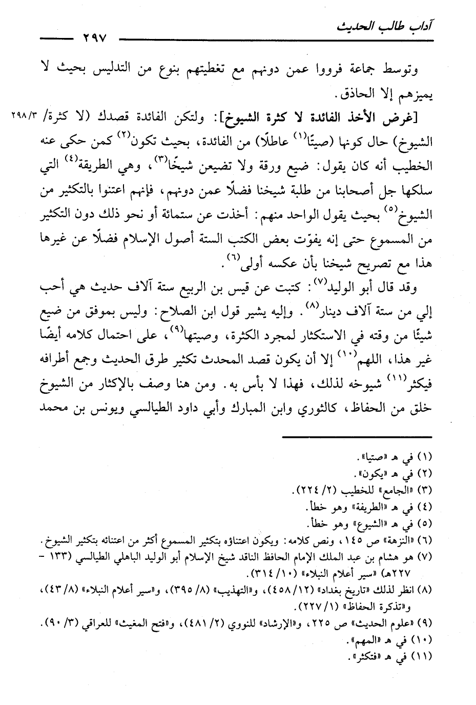وَإِلَيْهِ يُشِيرُ قَوْلُ ابْنِ الصَّلَاحِ: وَلَيْسَ بِمُوَفَّقٍ مَنْ ضَيَّعَ شَيْئًا مِنْ وَقْتِهِ فِي الِاسْتِكْثَارِ لِمُجَرَّدِ الْكَثْرَةِ وَصِيتِهَا، عَلَى احْتِمَالِ كَلَامِهِ أَيْضًا غَيْرَ هَذَا، اللَّهُمَّ إِلَّا أَنْ يَكُونَ قَصْدُ الْمُحَدِّثِ تَكْثِيرَ طُرُقِ الْحَدِيثِ، وَجَمْعَ أَطْرَافِهِ، فَيَكْثُرُ شُيُوخُهُ لِذَلِكَ، فَهَذَا لَا بَأْسَ بِهِ.