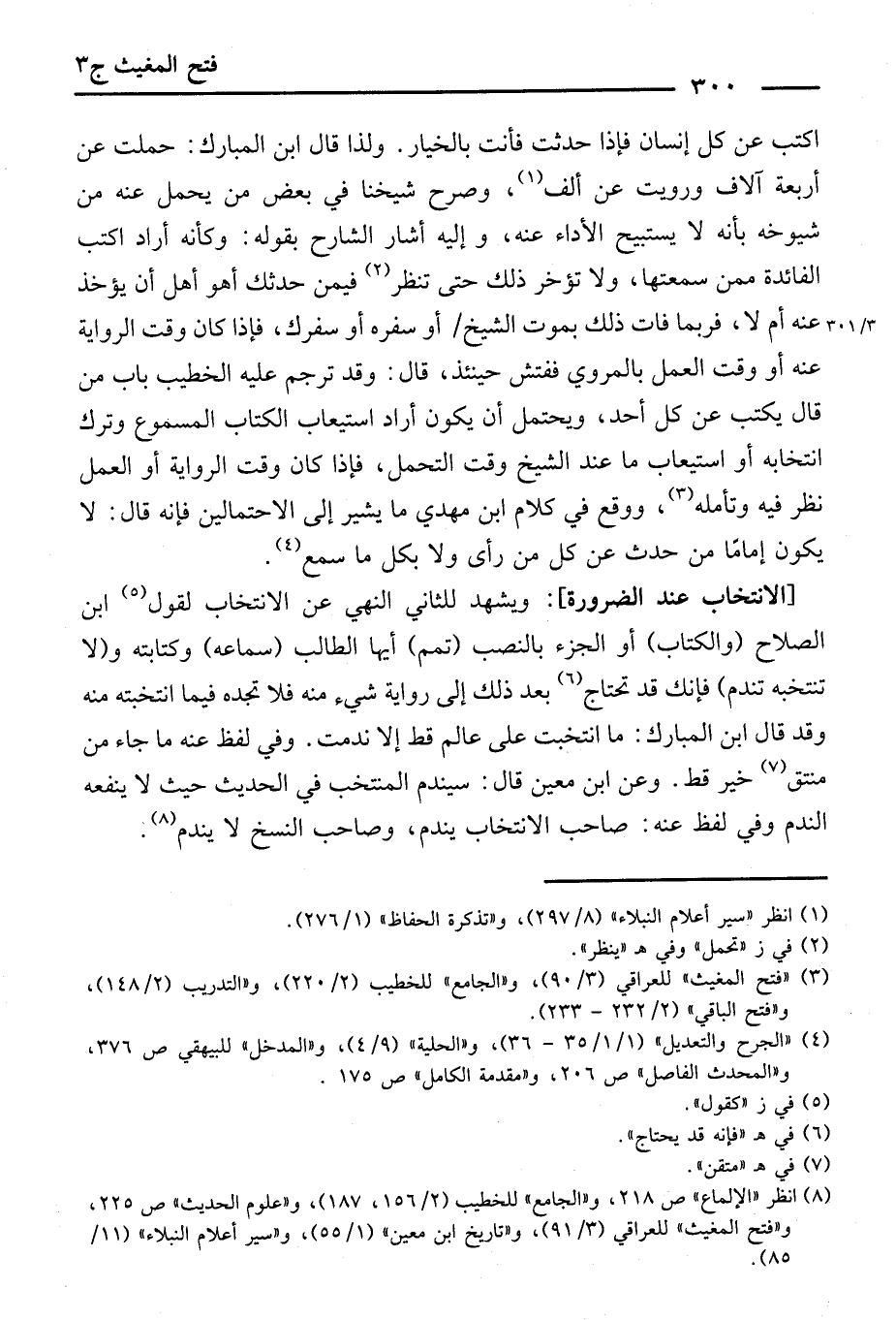 [الِانْتِخَابِ عِنْدَ الضَّرُورَةَ] وَيَشْهَدُ لِلثَّانِي النَّهْيُ عَنِ الِانْتِخَابِ ; لِقَوْلِ ابْنِ الصَّلَاحِ: (وَالْكِتَابَ) ، أَوِ الْجُزْءَ، بِالنَّصْبِ (تَمِّمْ) أَيُّهَا الطَّالِبُ (سَمَاعَهُ) وَكِتَابَتَهُ، وَ (لَا تَنْتَخِبْهُ تَنْدَمِ) ; فَإِنَّكَ قَدْ تَحْتَاجُ بَعْدَ ذَلِكَ إِلَى رِوَايَةِ شَيْءٍ مِنْهُ، فَلَا تَجِدُهُ فِيمَا انْتَخَبْتَهُ مِنْهُ، وَقَدْ قَالَ ابْنُ الْمُبَارَكِ: مَا انْتَخَبْتُ عَلَى عَالِمٍ قَطُّ إِلَّا نَدِمْتُ.