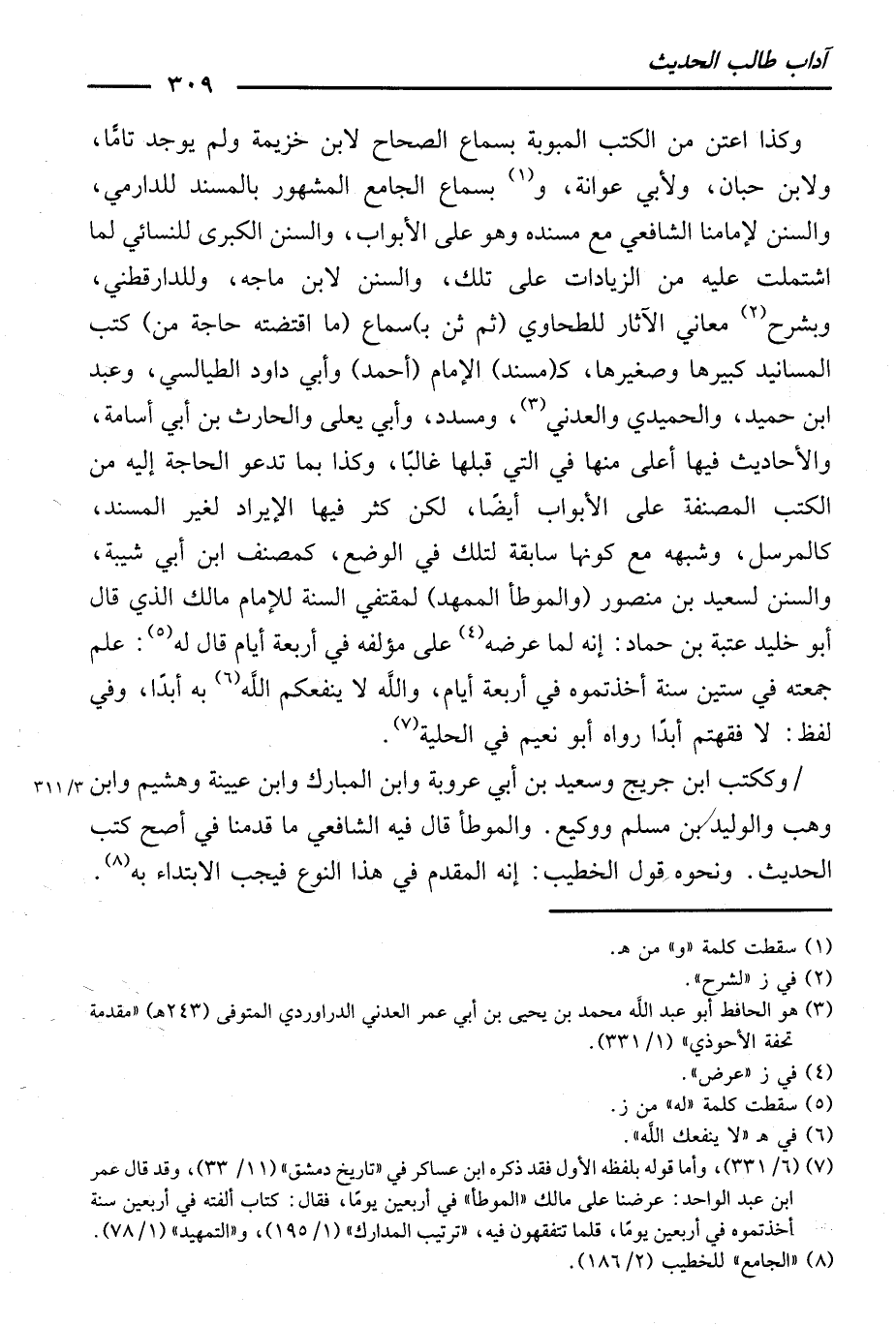 وَكَذَا بِمَا تَدْعُو الْحَاجَةُ إِلَيْهِ مِنَ الْكُتُبِ الْمُصَنَّفَةِ عَلَى الْأَبْوَابِ أَيْضًا، لَكِنْ كَثُرَ فِيهَا الْإِيرَادُ لِغَيْرِ الْمُسْنَدِ، كَالْمُرْسَلِ وَشِبْهِهِ، مَعَ كَوْنِهَا سَابِقَةً لِتِلْكَ فِي الْوَضْعِ ; (كَمُصَنَّفِ ابْنِ أَبِي شَيْبَةَ) وَ (السُّنَنِ لِسَعِيدِ بْنِ مَنْصُورٍ) وَ (الْمُوَطَّأِ الْمُمَهَّدِ) لِمُقْتَفِي السُّنَّةِ لِلْإِمَامِ مَالِكٍ الَّذِي قَالَ أَبُو خُلَيْدٍ عُتْبَةُ بْنُ حَمَّادٍ: إِنَّهُ لَمَّا عَرَضَهُ عَلَى مُؤَلِّفِهِ فِي أَرْبَعَةِ أَيْامٍ قَالَ لَهُ: عِلْمٌ جَمَعْتُهُ فِي سِتِّينَ سَنَةً أَخَذْتُمُوهُ فِي أَرْبَعَةِ أَيْامٍ، وَاللَّهِ لَا يَنْفَعُكُمُ اللَّهُ بِهِ أَبَدًا، وَفِي لَفْظٍ: لَا فَقِهْتُمْ أَبَدًا. رَوَاهُ أَبُو نُعَيْمٍ فِي (الْحِلْيَةِ) .