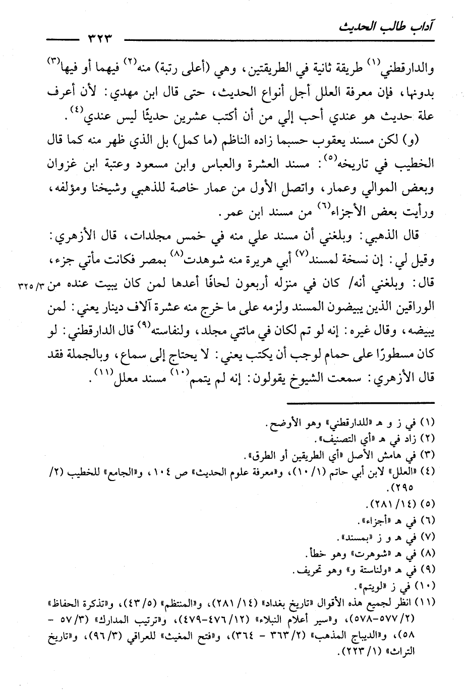 وَقَالَ غَيْرُهُ: إِنَّهُ لَوْ تَمَّ لَكَانَ فِي مِائَتَيْ مُجَلَّدٍ، وَلِنَفَاسَتِهِ قَالَ الدَّارَقُطْنِيُّ: لَوْ كَانَ مَسْطُورًا عَلَى حَمَامٍ لَوَجَبَ أَنْ يُكْتَبَ، يَعْنِي: لَا يَحْتَاجُ إِلَى سَمَاعٍ. وَبِالْجُمْلَةِ فَقَدْ قَالَ الْأَزْهَرِيُّ: سَمِعْتُ الشُّيُوخَ يَقُولُونَ: إِنَّهُ لَمْ يَتْمُمْ مُسْنَدٌ مُعَلَّلٌ.